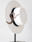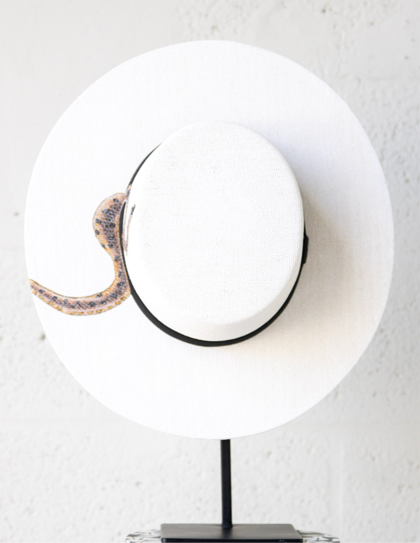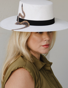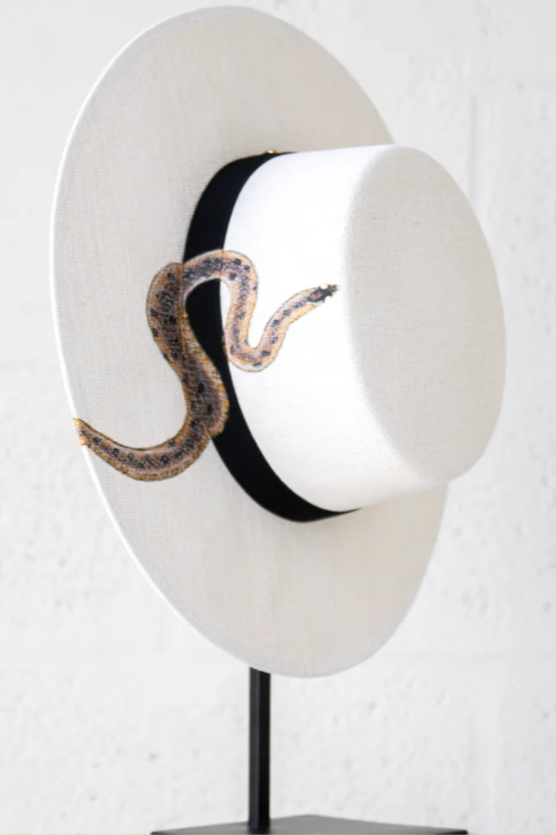 A bold statement piece, our Cordobes Snake hand-painted hat is elevated with a lifelike serpent that coils seamlessly across the crown and brim. The snake motif, rendered in rich earthy tones with subtle golden highlights, adds an air of mystery, strength, and transformation.