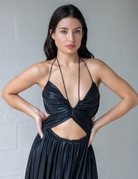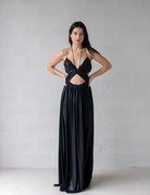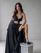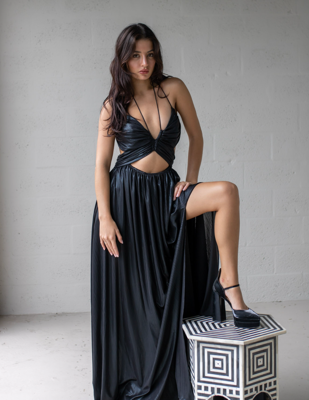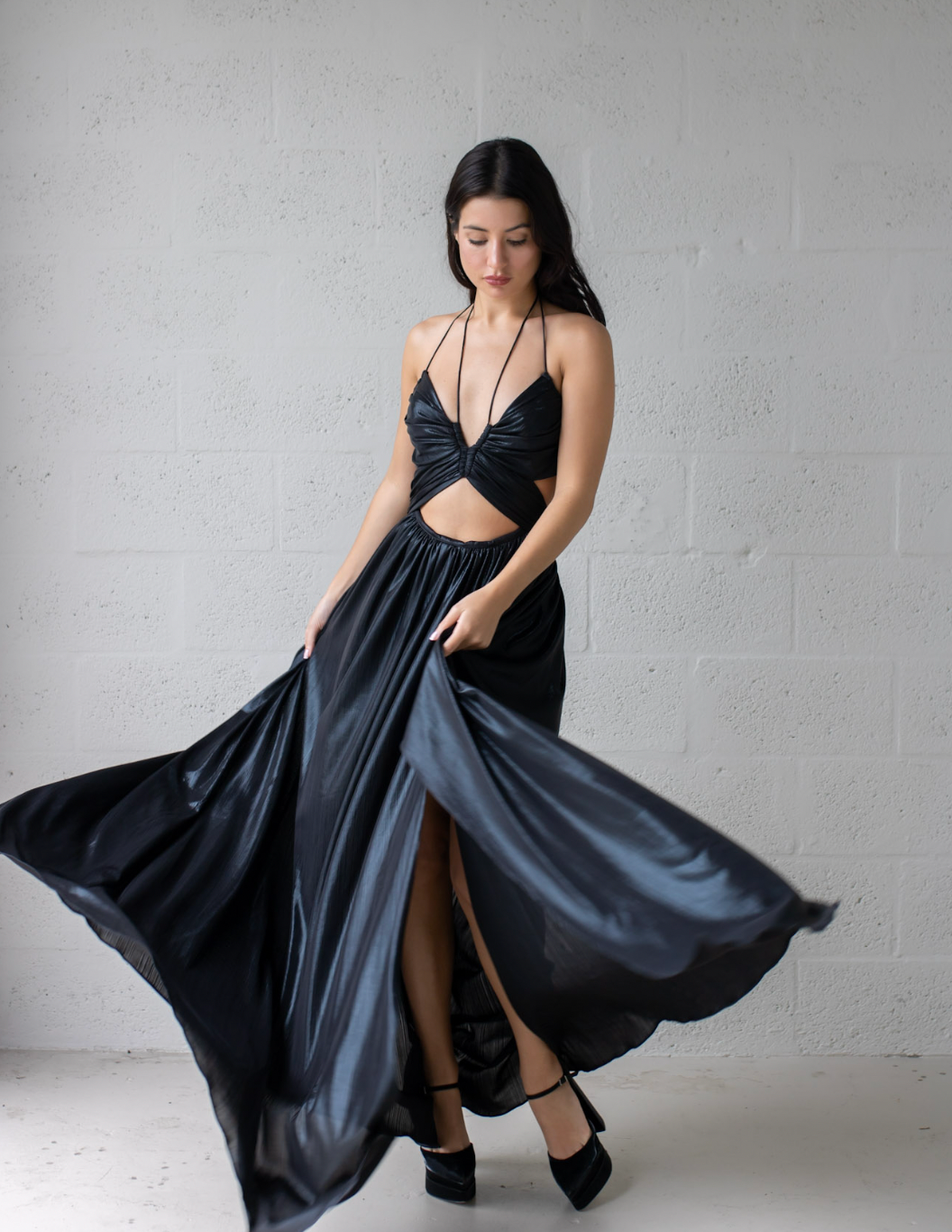 Our Querendona dress is a stunning floor-length gown that exudes elegance and allure. Made from a luxurious, flowing fabric, it hugs the body before cascading down to the ground. The dress features daring thigh-high slits on both sides, allowing for ease of movement and a glimpse of the legs with every step. Strategically placed cutouts along the waist and back add an element of surprise and sensuality, revealing just the right amount of skin while maintaining a sophisticated look.