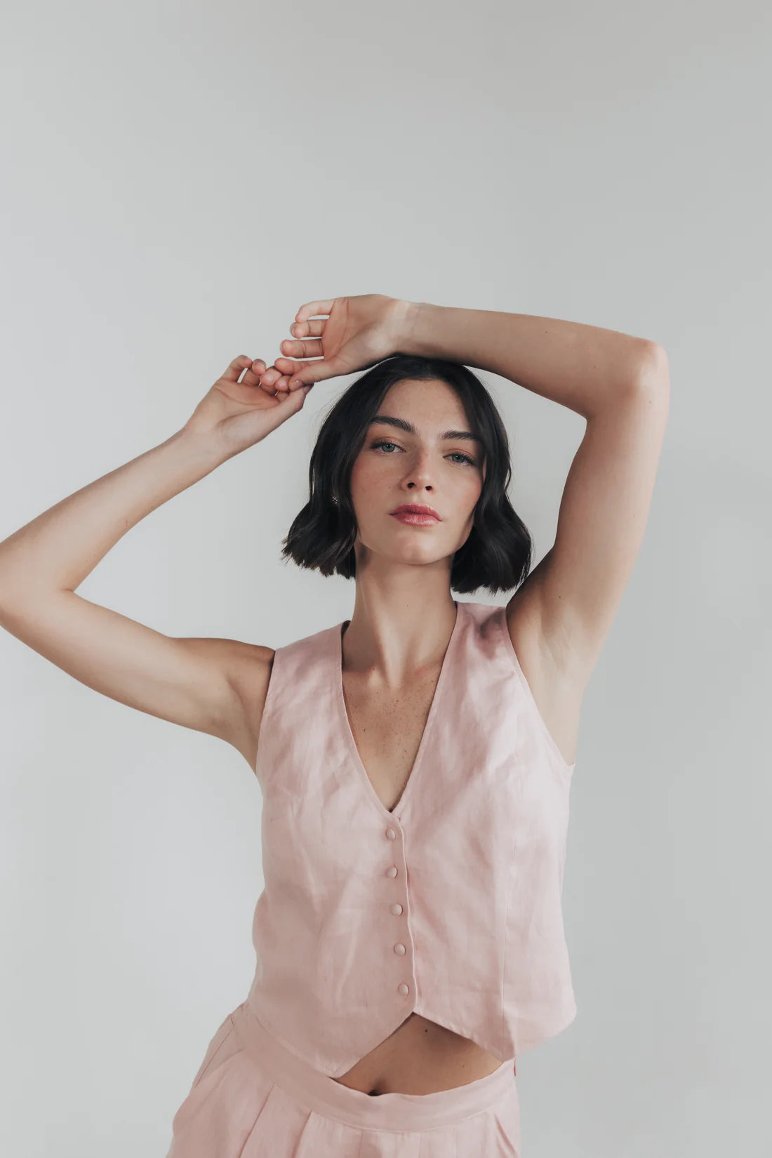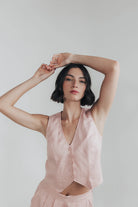 A softly tailored vest with a deep V-neckline and a clean button-down front. Designed to elevate everyday looks with an effortless, modern feel. Wear it solo for a bold statement or layer it for an easy chic finish. Minimal, versatile, and endlessly wearable.