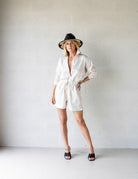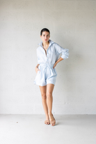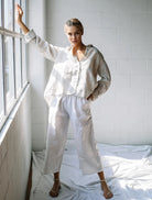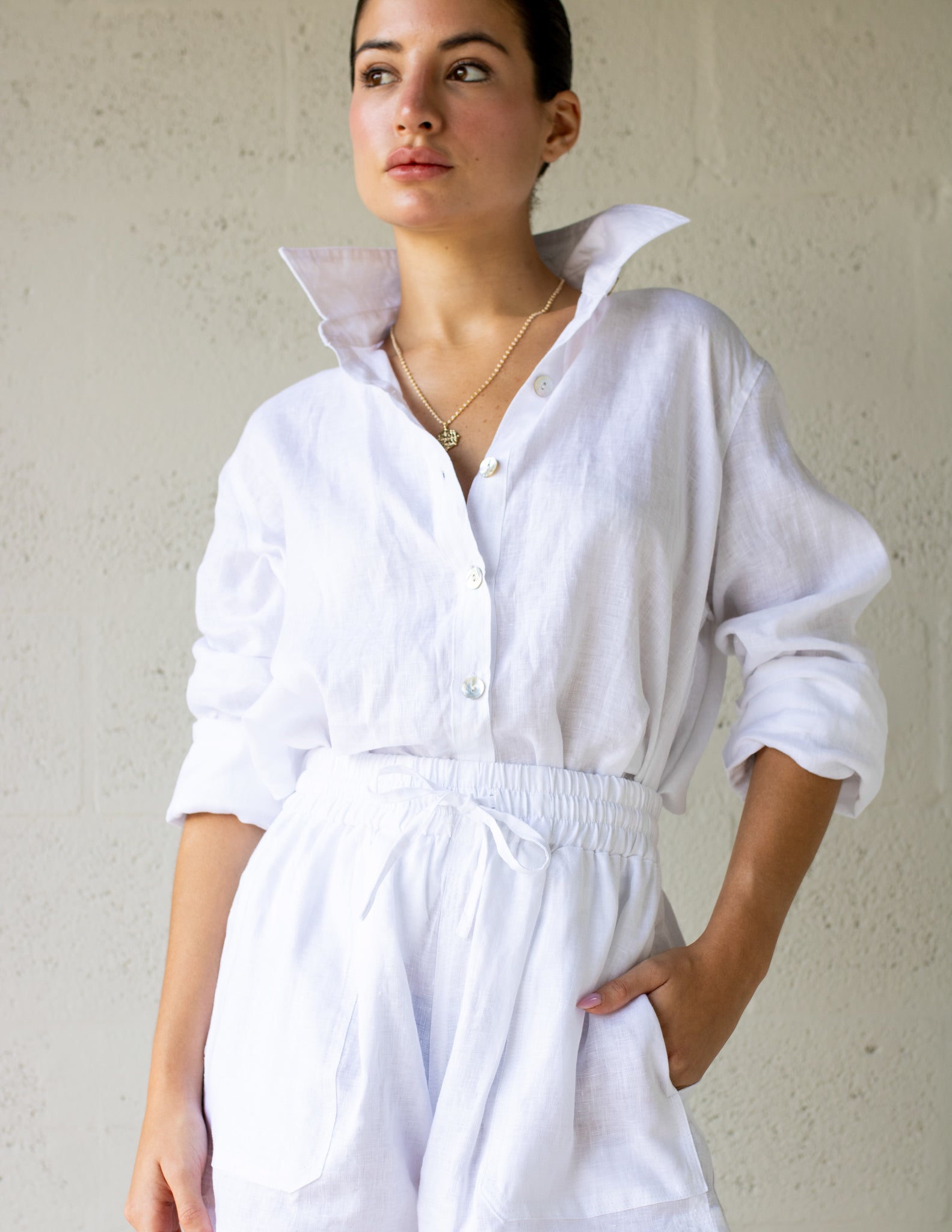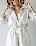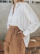 The Lizzie Linen Botton Up is the effortless wardrobe staple. Made from 100% linen. Features a collar, a button-down front, buttoned cuffs and an asymmetric hem line.