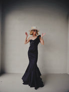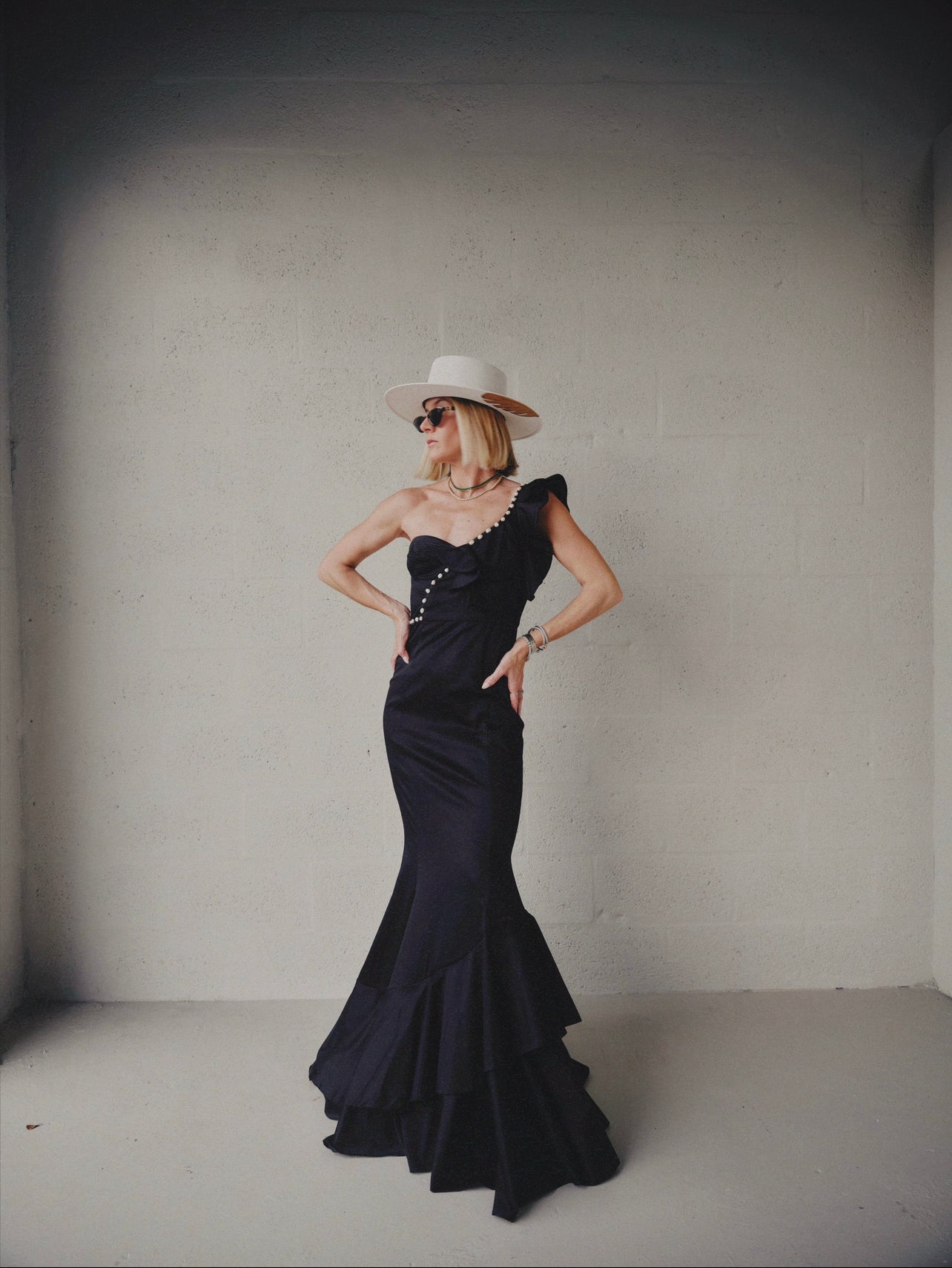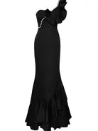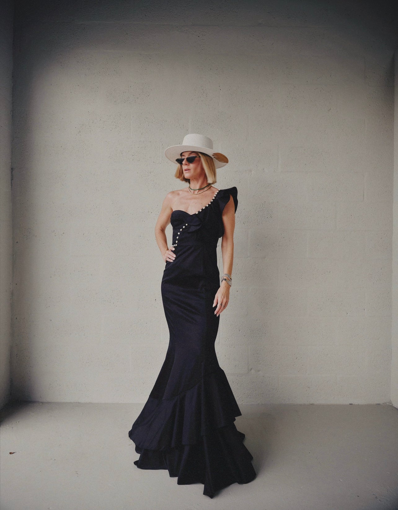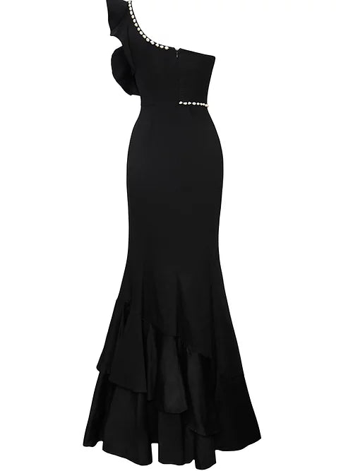 One shoulder mermaid silhouette with hand-embroidered ruffle and natural pearl detailing.