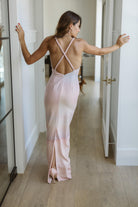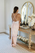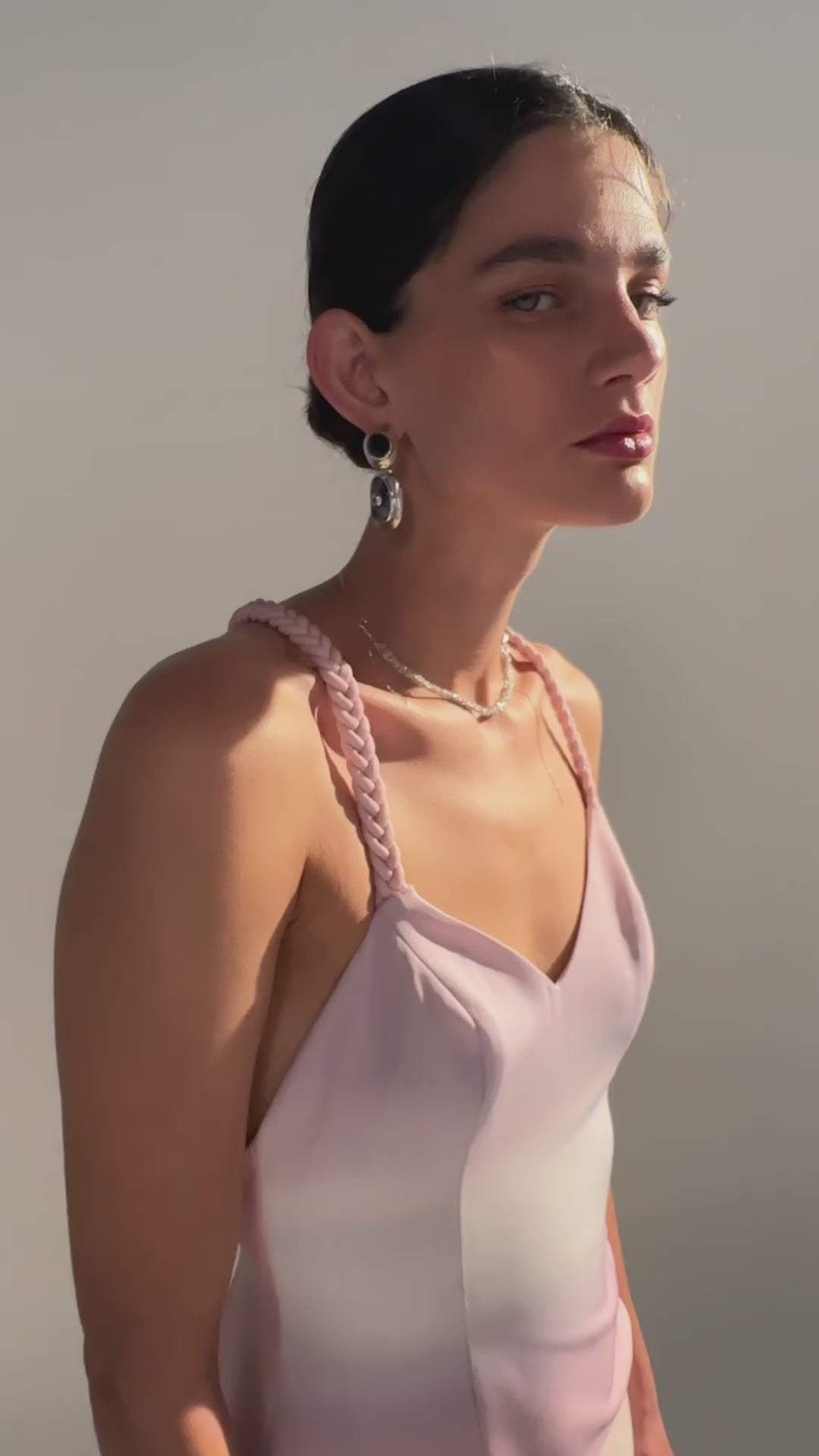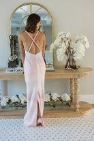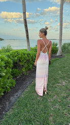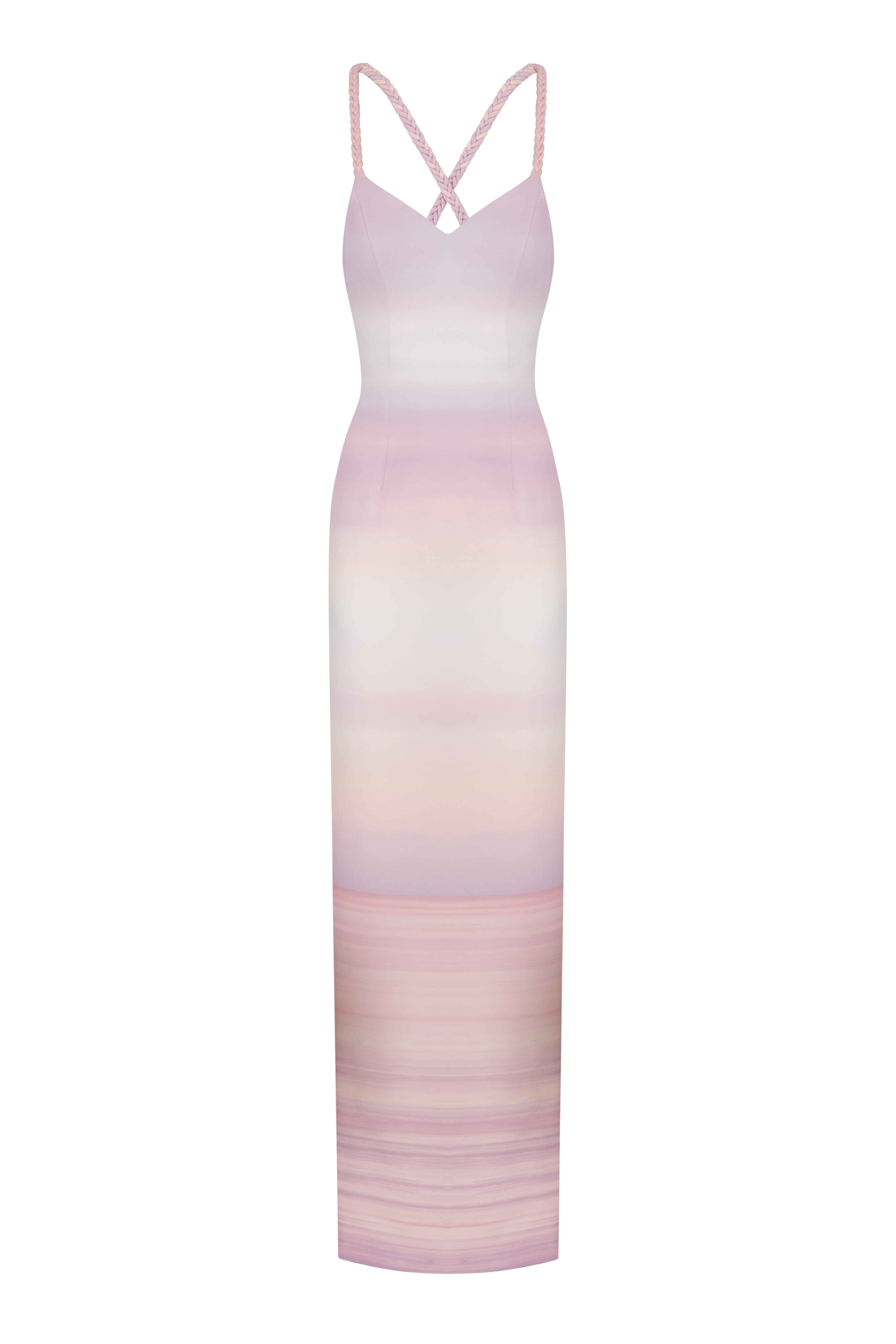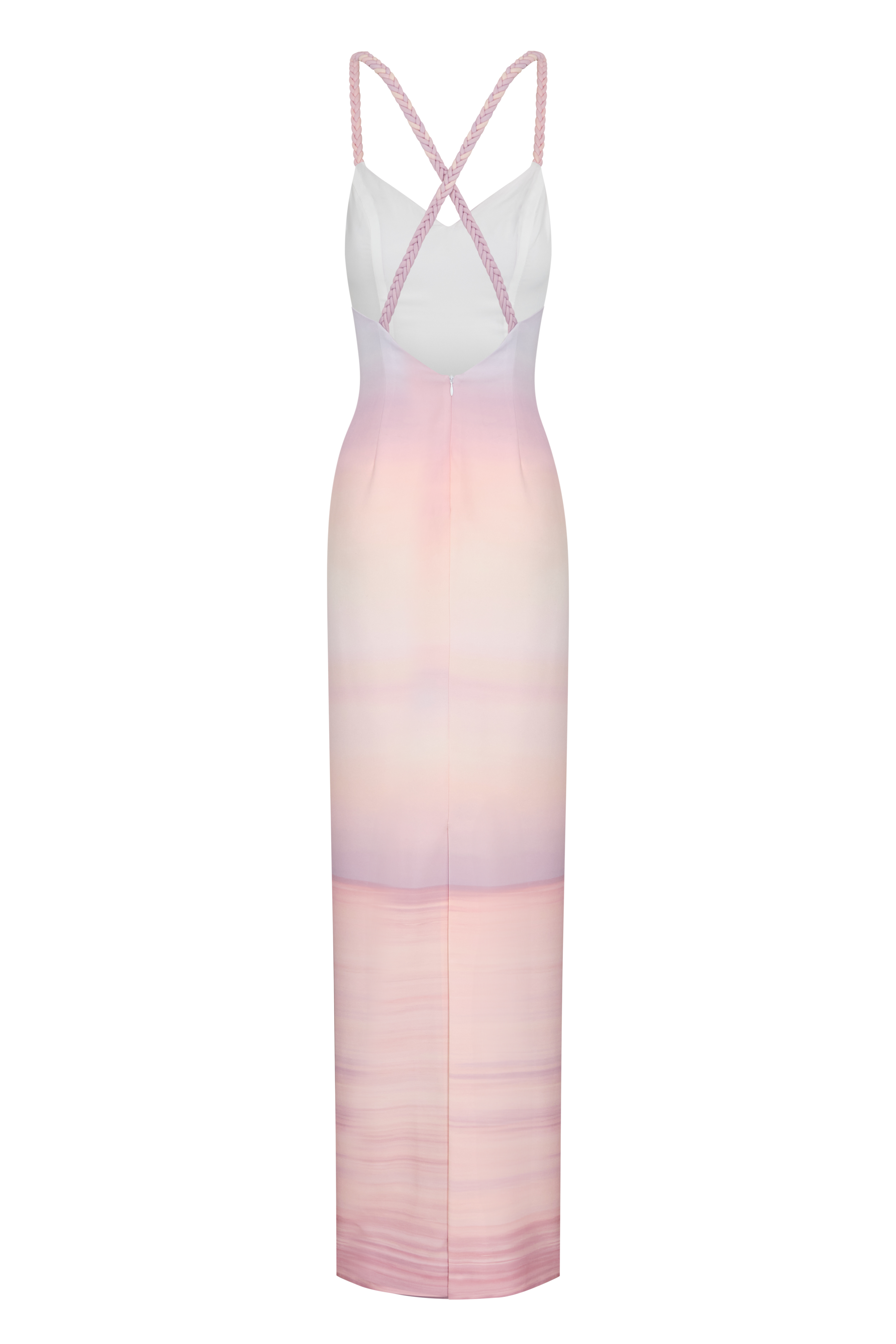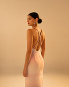 Column-style maxi dress. The open back is crossed by intertwined straps, crafted with our iconic handmade braids.