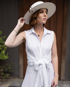 The crisp fabric adds a fresh, minimalist vibe, making it versatile enough for both casual outings and more formal occasions.