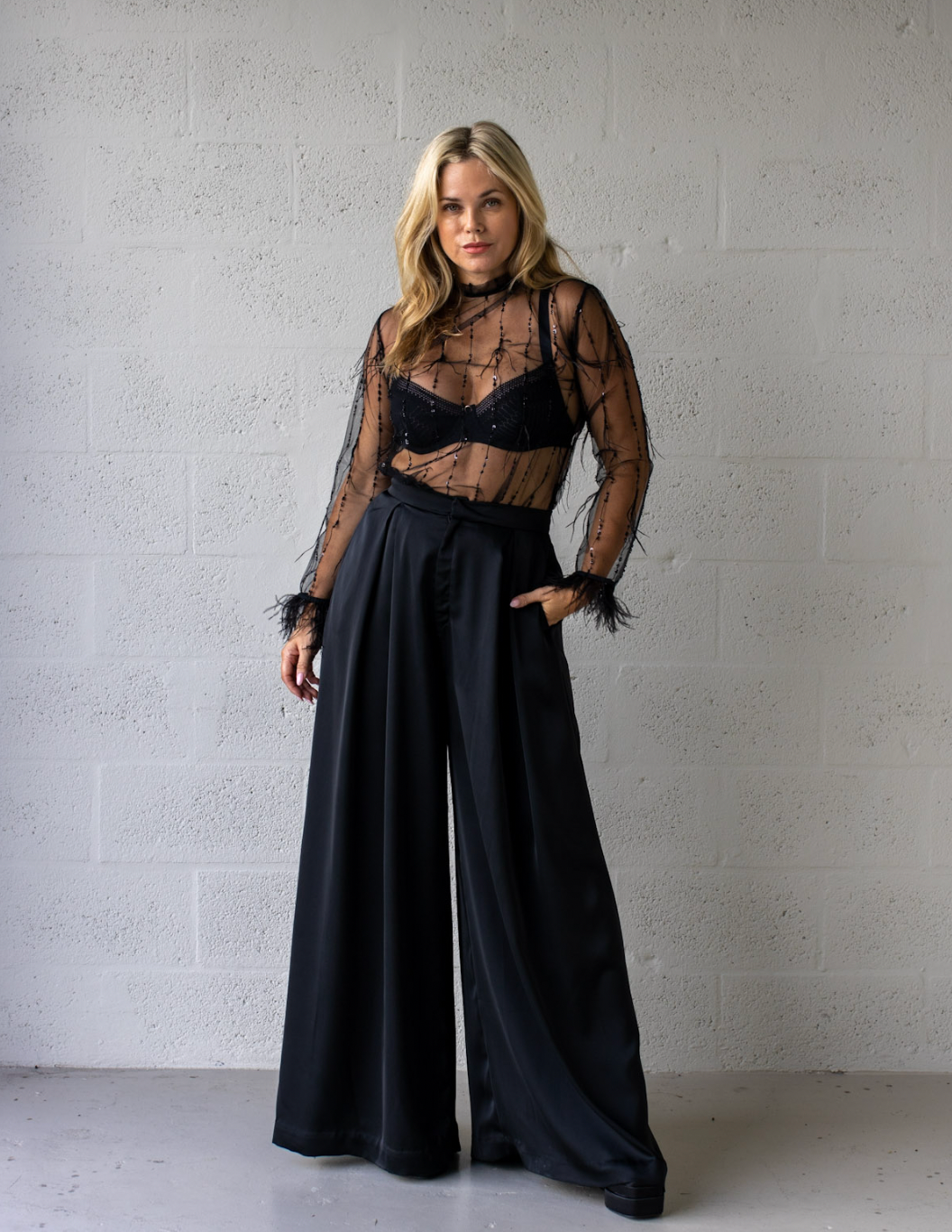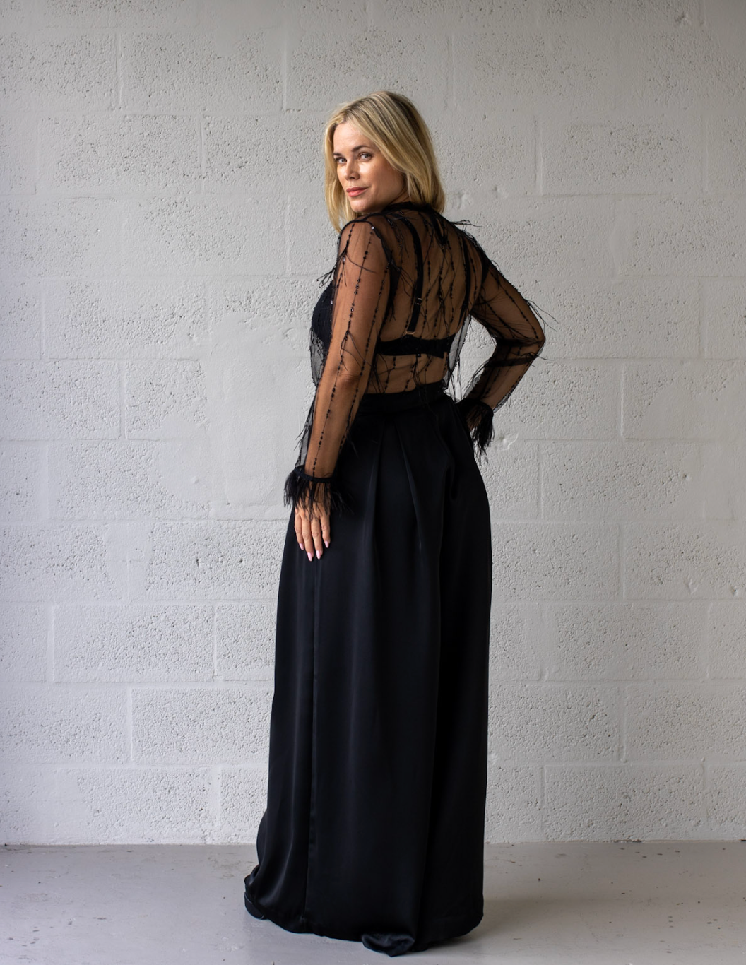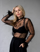 Long-sleeved mesh top with beading and embroidered feather, feathers on the sleeves and buttons at the neck.