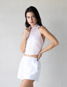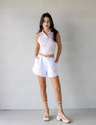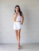 Your go-to shorts have arrived. Style our white shorts with our one-of-a-kind PIN TOPS for the perfect summer set.