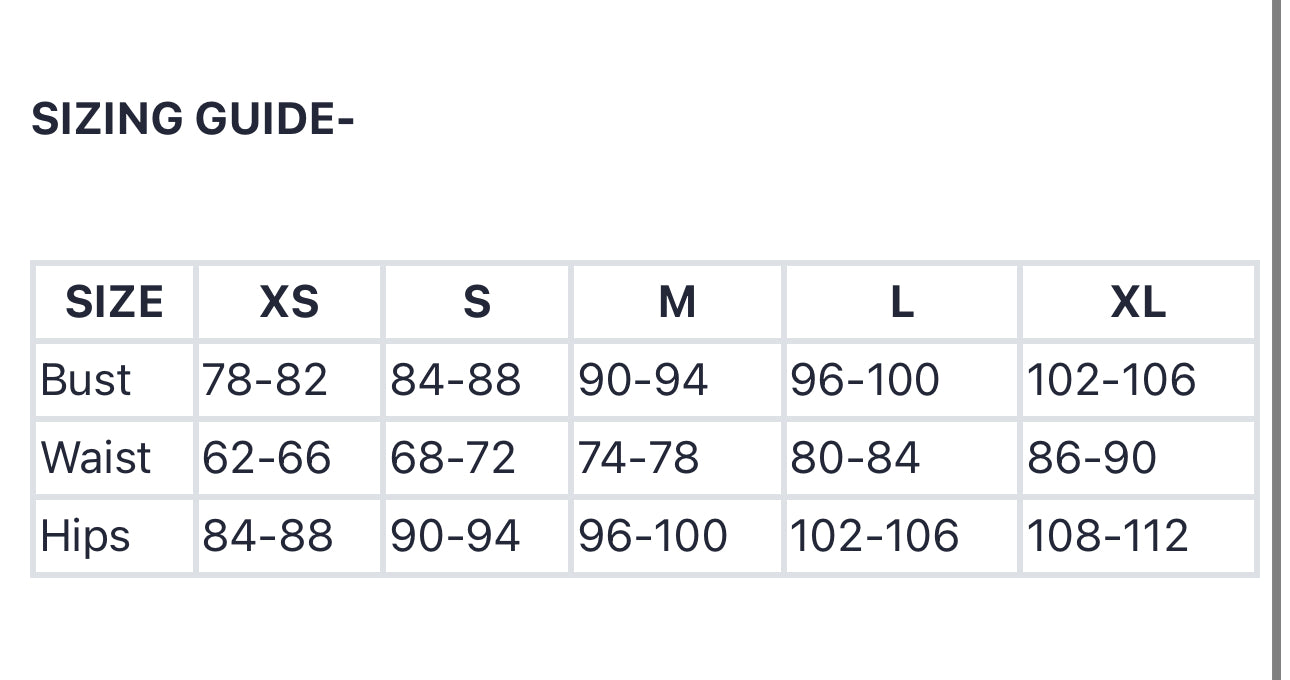 | Hips | 84-88 | 90-94 | 96-100 | 102-106 | 108-112 |