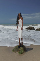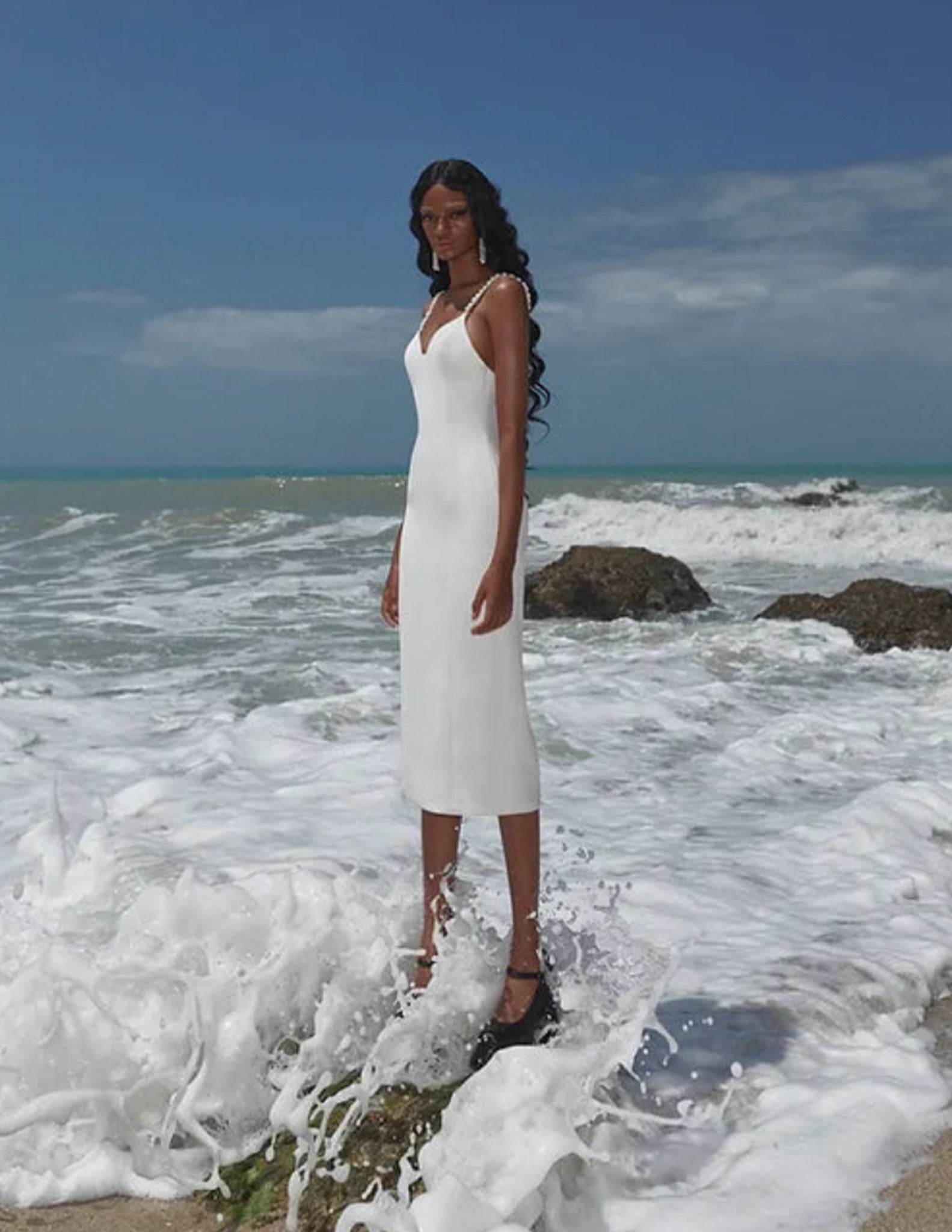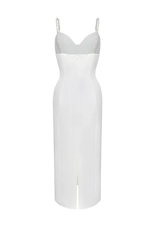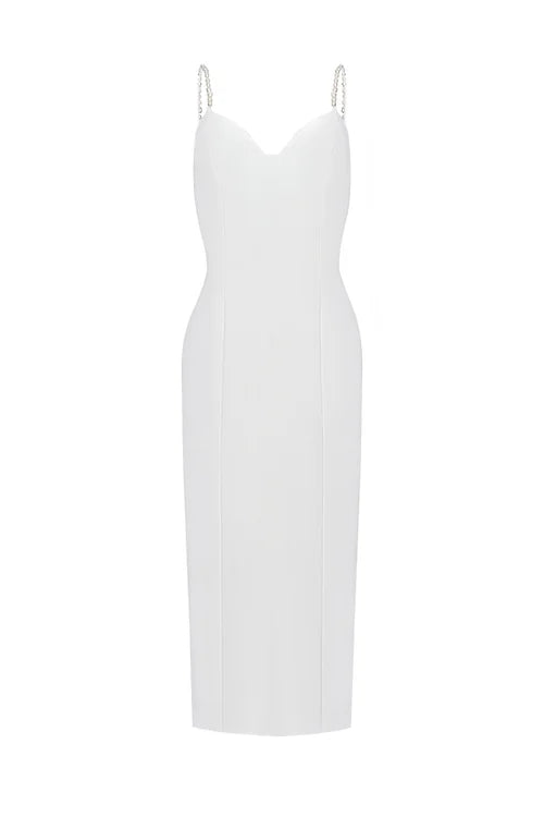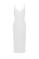 This white midi dress exudes elegance with a clean, fitted silhouette that falls just below the knee. The fabric is soft creating a smooth, flattering shape.