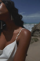 The dress’s standout feature is its delicate spaghetti straps, adorned with small, lustrous pearls that add a touch of sophistication and charm. The pearls catch the light subtly, making them sparkle with each movement.