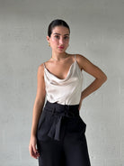 Indulge in luxury with our Silky Tank Top. This basic blouse is elevated with its silky fabric, offering a smooth and elegant feel on your skin. Perfect for any occasion, this tank top effortlessly combines comfort and sophistication. Enhance your wardrobe with this exclusive piece.
