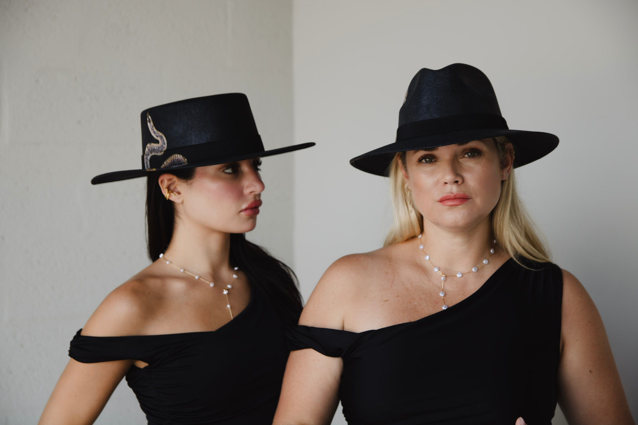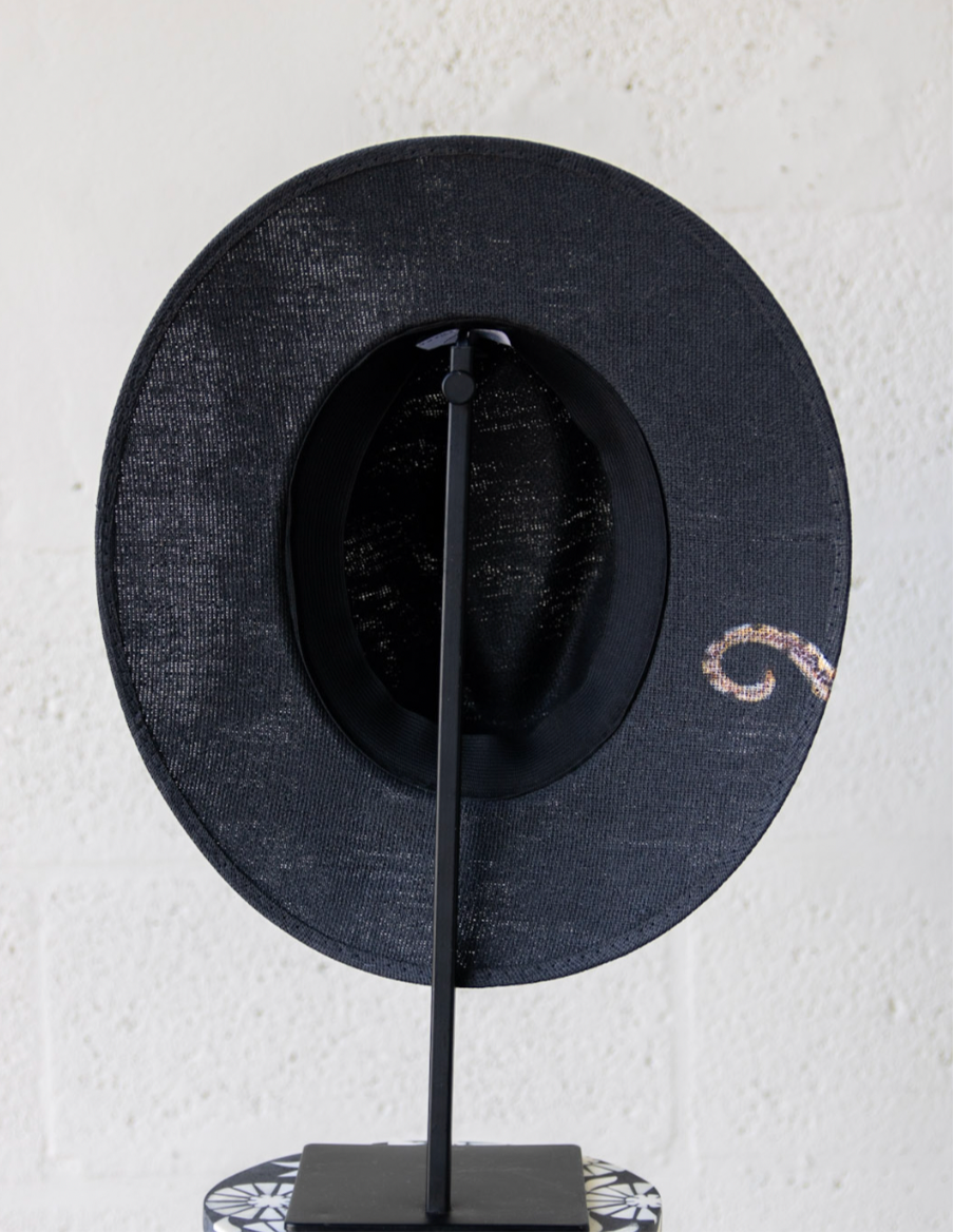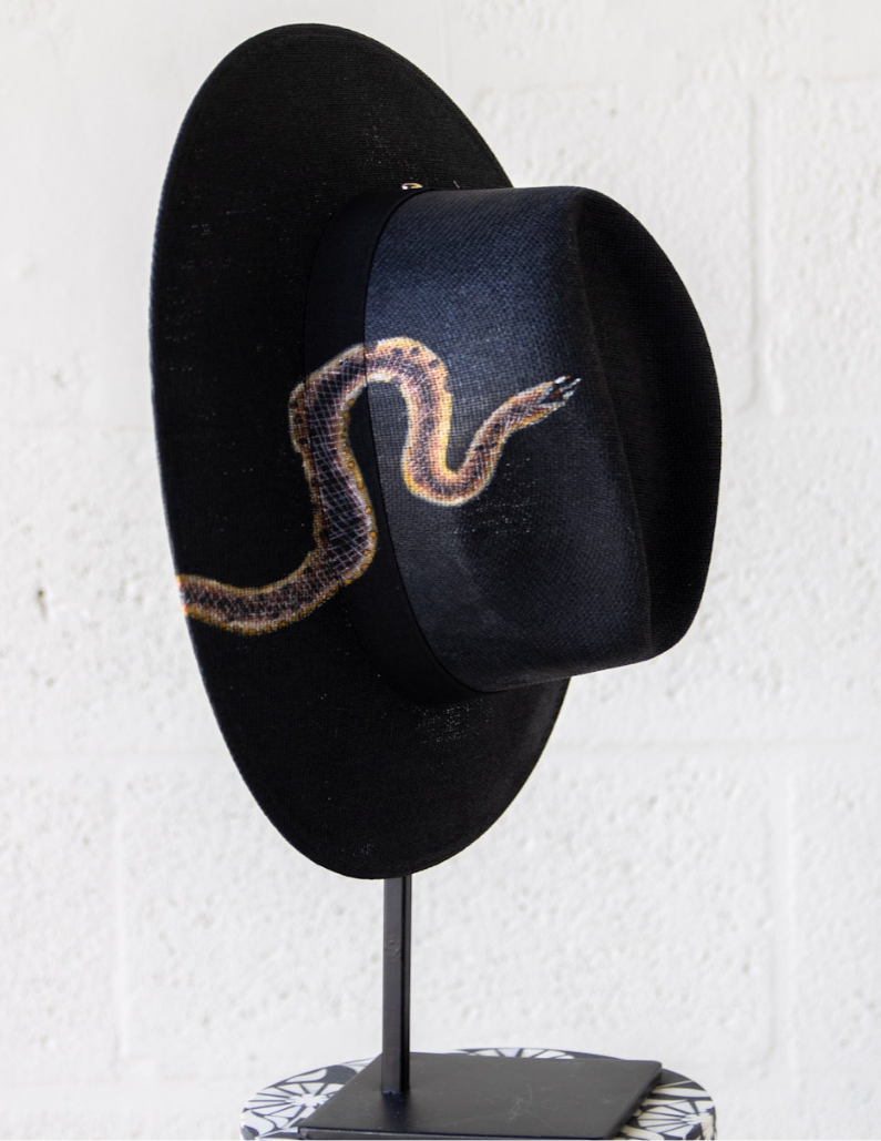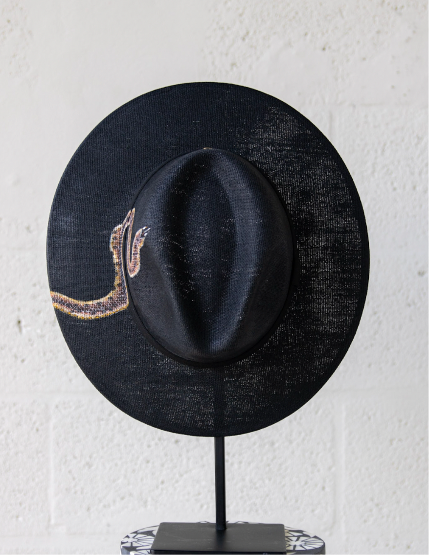 A bold statement piece, this black hand-painted hat is elevated with a lifelike serpent that coils seamlessly across the crown and brim. The snake motif, rendered in rich earthy tones with subtle golden highlights, adds an air of mystery, strength, and transformation.