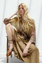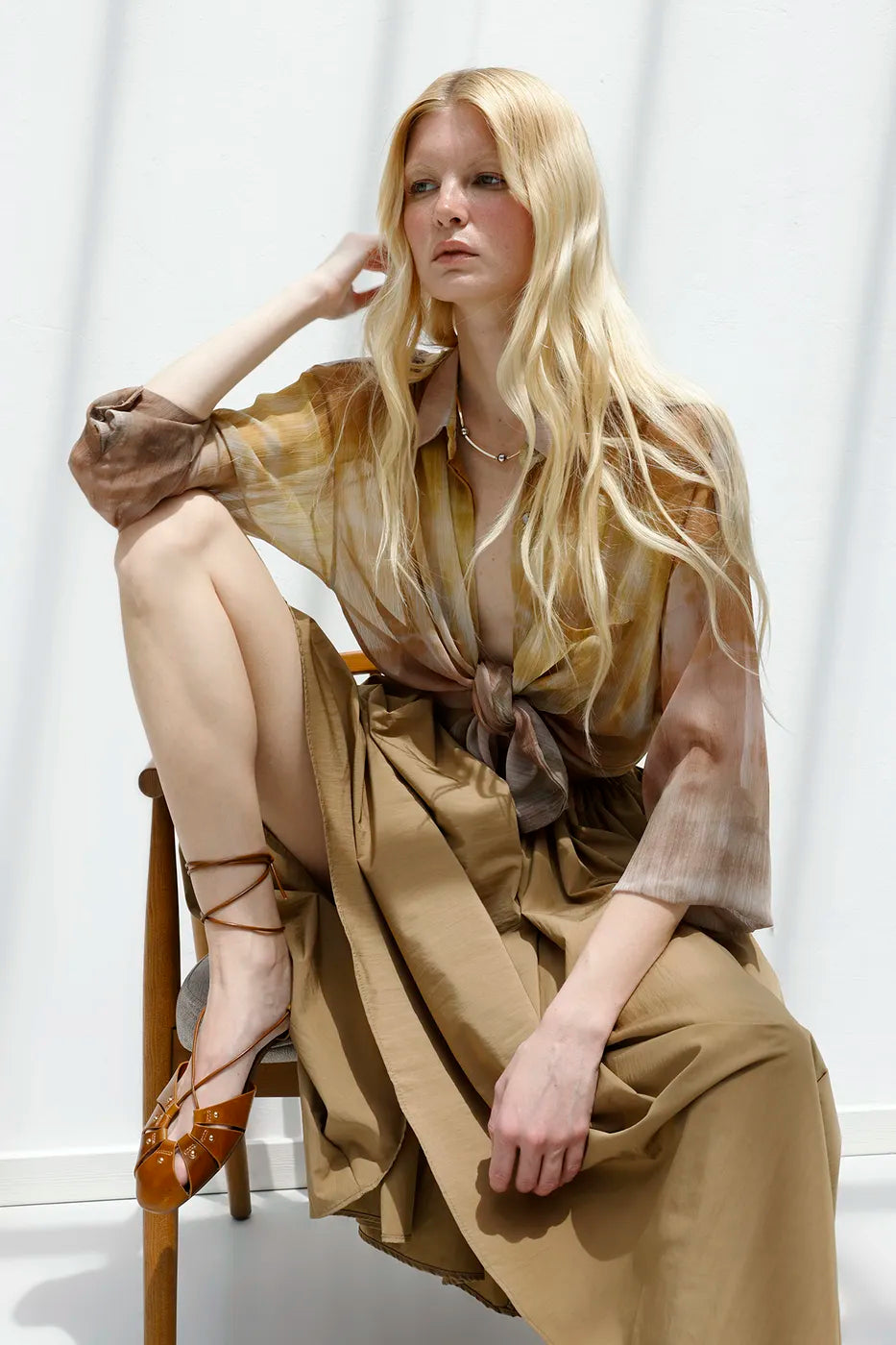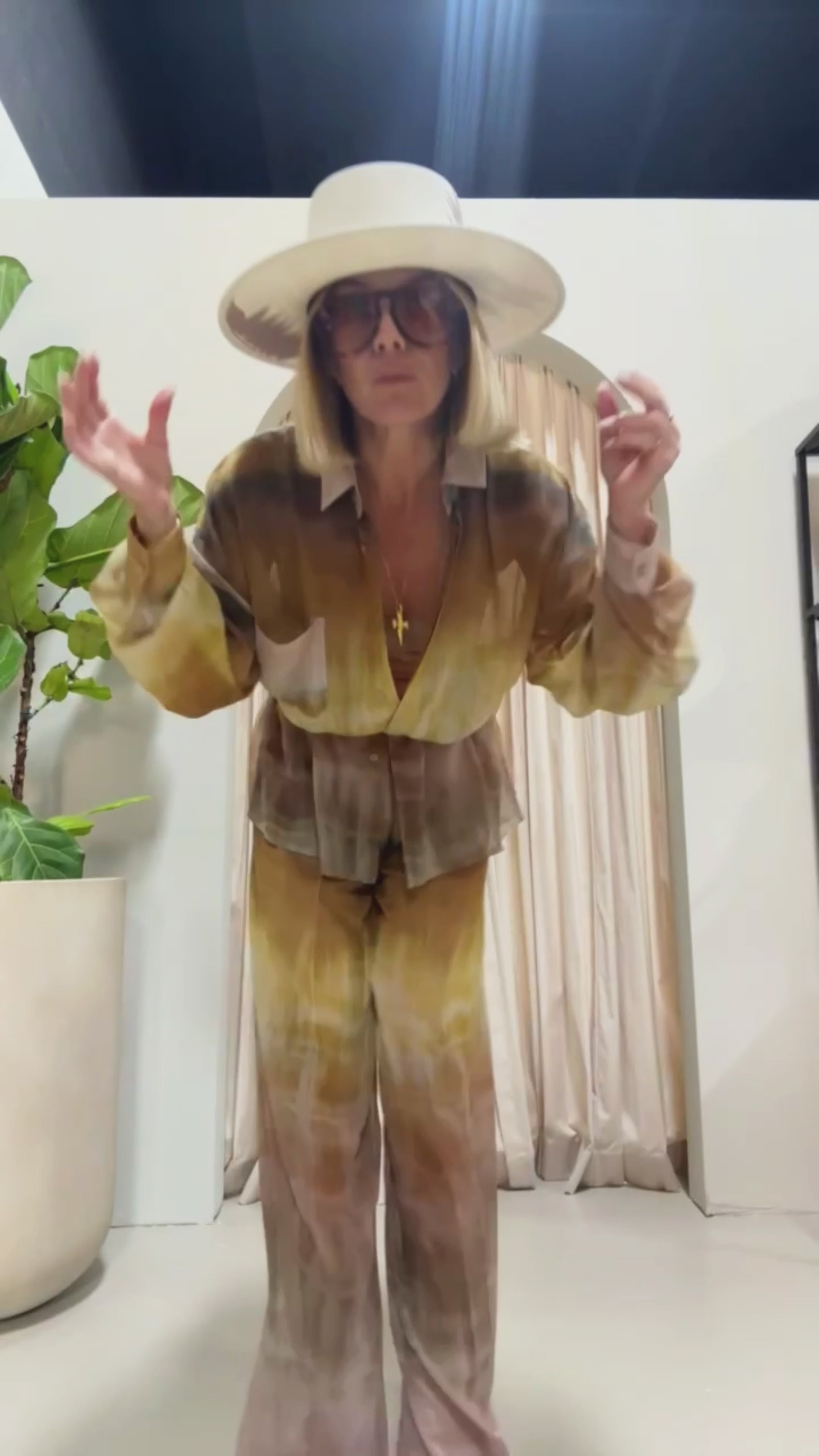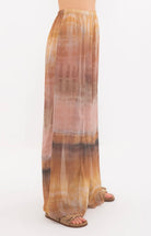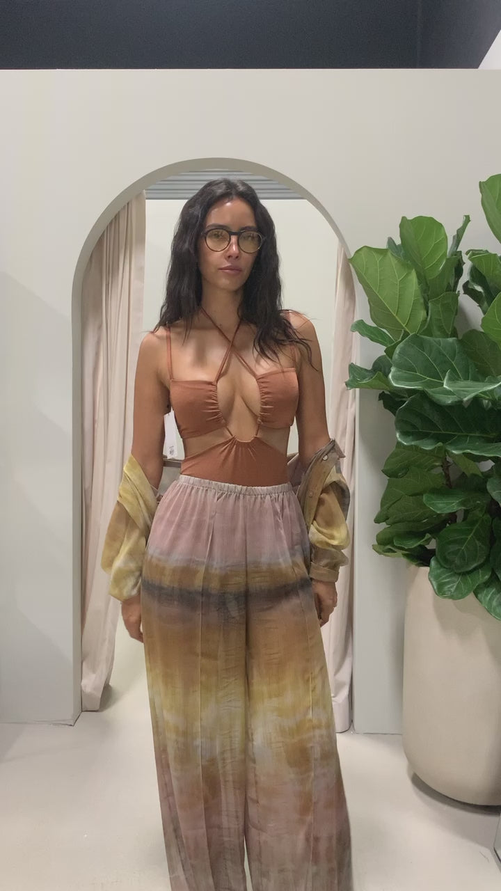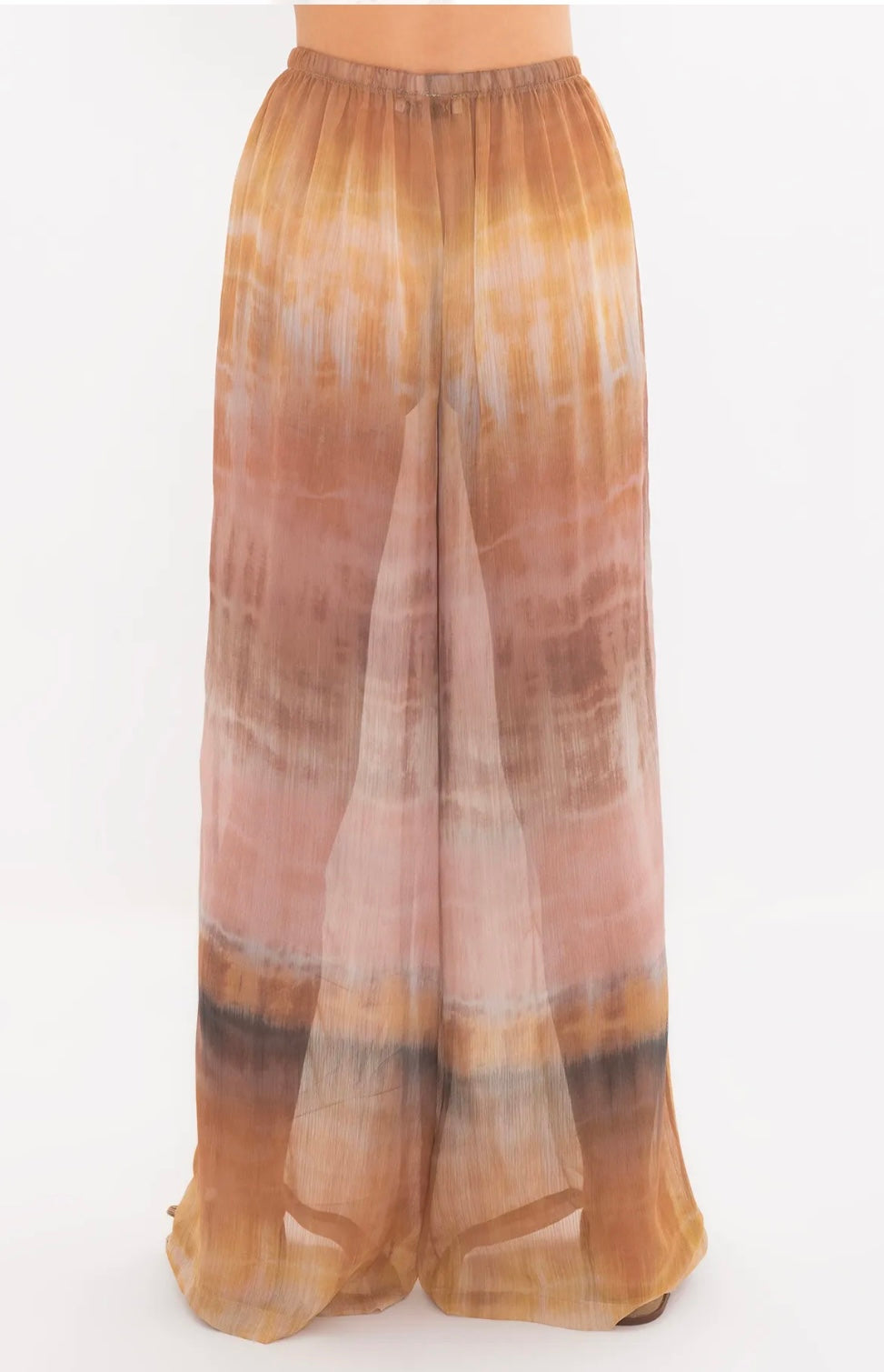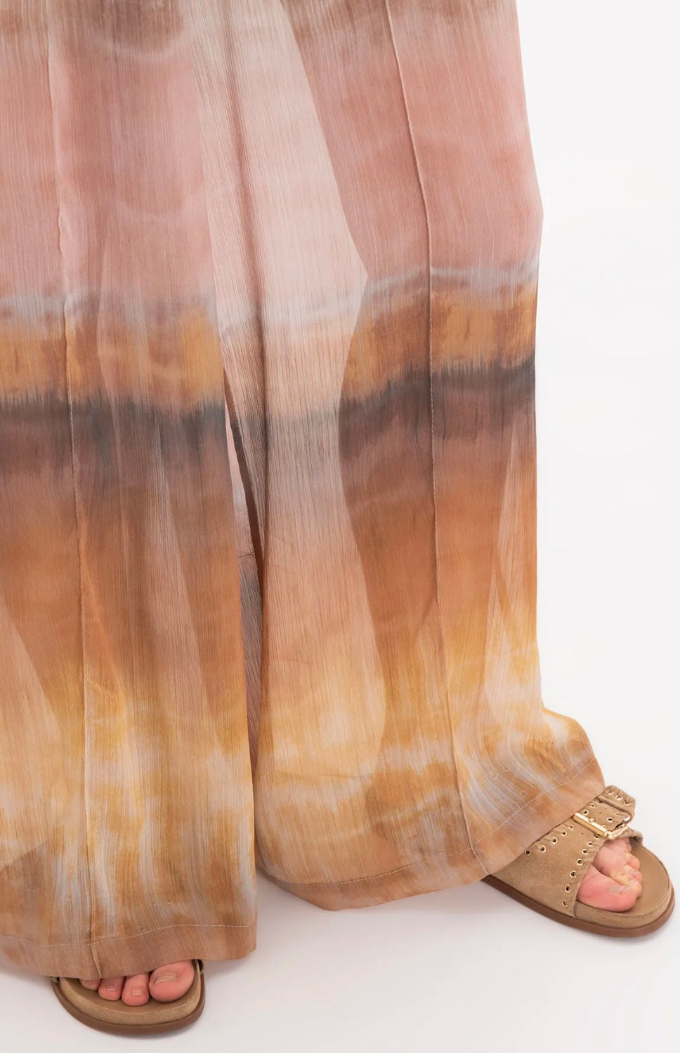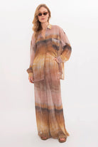 Elevate your resort-ready wardrobe with our effortlessly chic Sunset Mirage Set. This matching top and wide-leg pant duo is crafted from lightweight, breathable fabric that drapes beautifully, offering comfort without sacrificing style. The dreamy, watercolor-inspired print blends earthy tones of amber, sienna, and soft charcoal for a look that feels both grounded and ethereal.