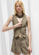 Structured yet easy, these tailored pleated shorts strike the perfect balance between polish and versatility. Designed with a high-rise waist and softly flared leg, they feature front pleats that add subtle volume and elongate the silhouette. Crafted from a mid-weight suiting fabric, they hold their shape while offering all-day comfort. A modern wardrobe staple you’ll reach for all season long.