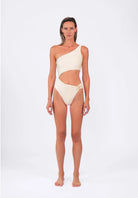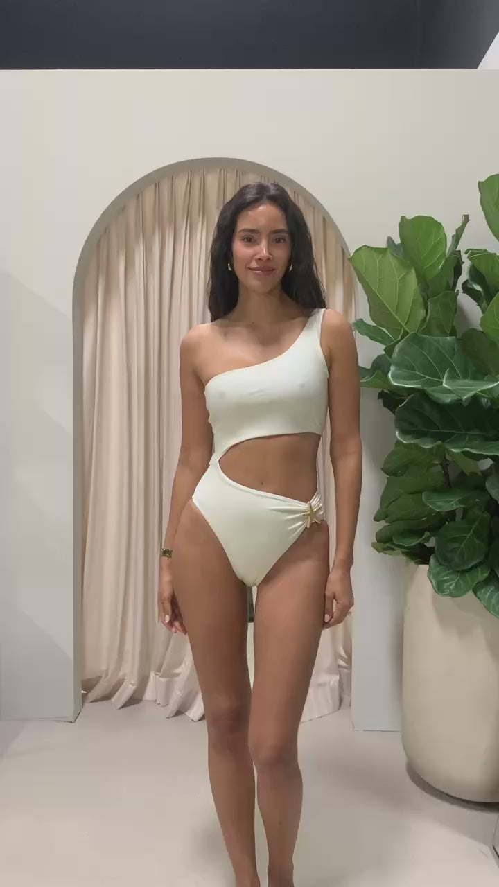Radiate elegance in this one-shoulder cut-out one-piece, crafted in a luminous champagne metallic fabric. Featuring a high-leg silhouette and removable pads for a flattering fit, it’s finished with waterproof 18k gold-plated star hardware for a touch of refined allure.