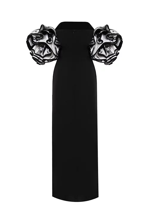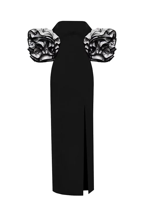 Strapless fitted dress with a straight silhouette with ruffled sleeves.