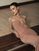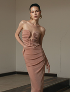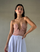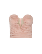 Body-hugging top with a draped effect, with an asymmetrical front neckline with underwire, made of recycled polyester. Zipper closure on the back. Lined