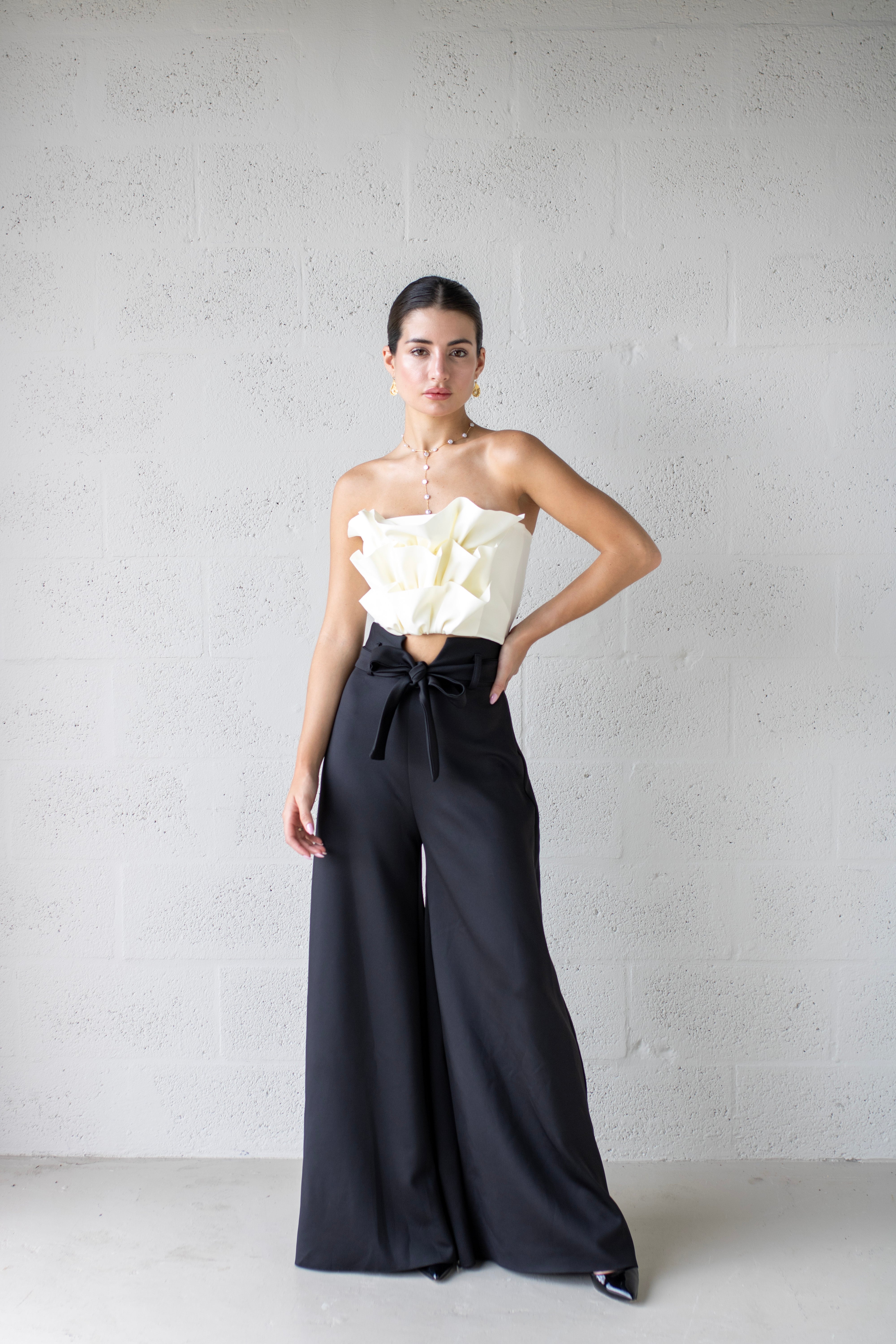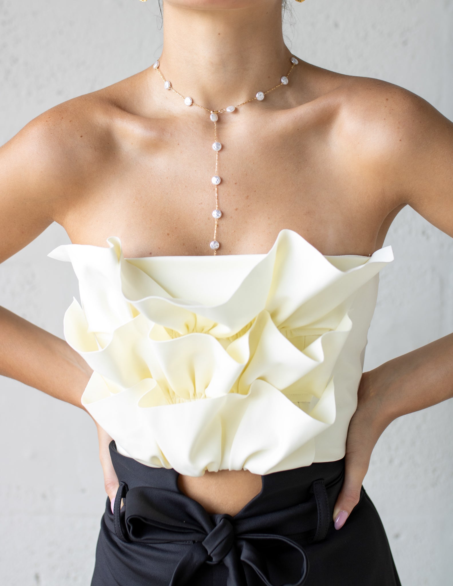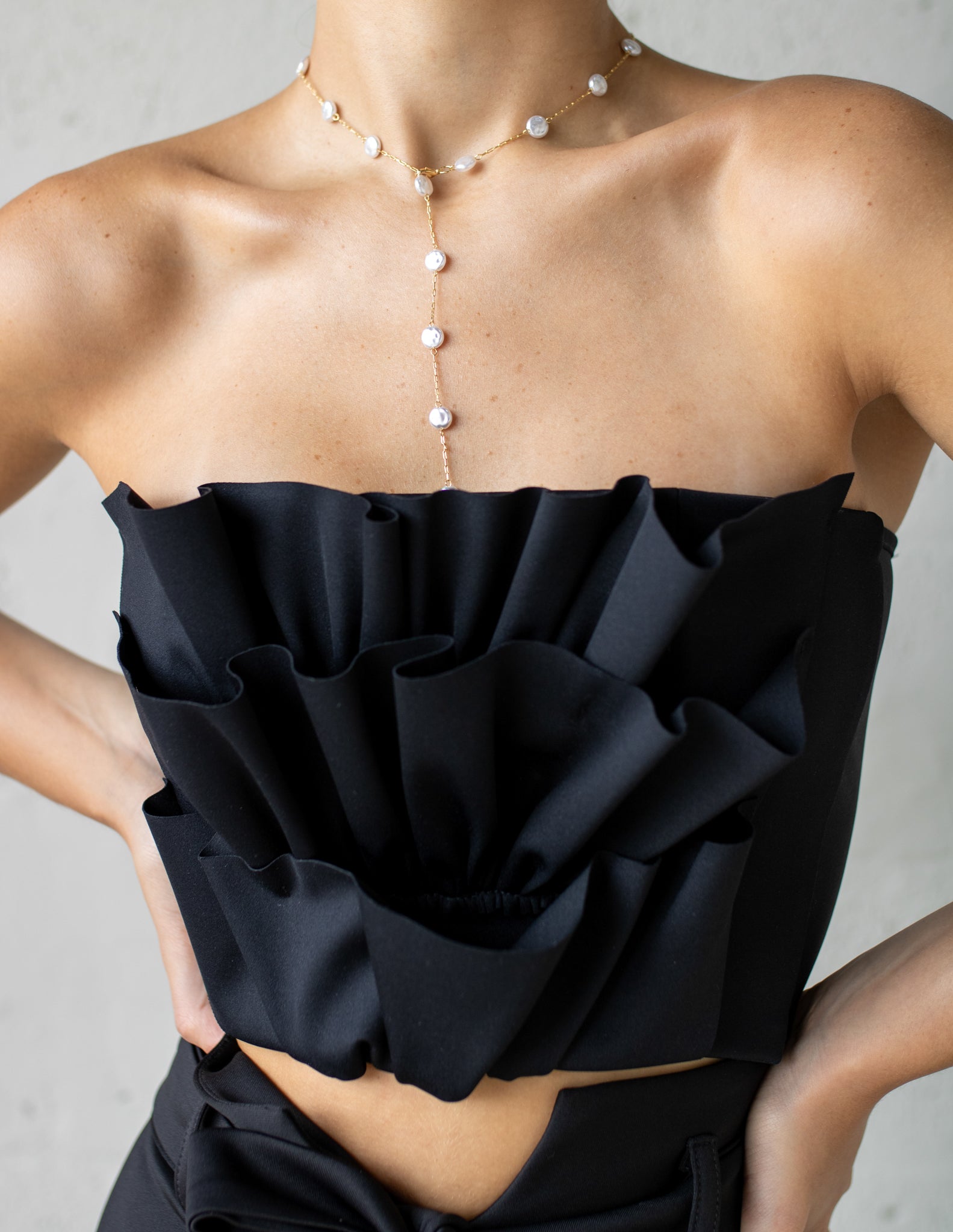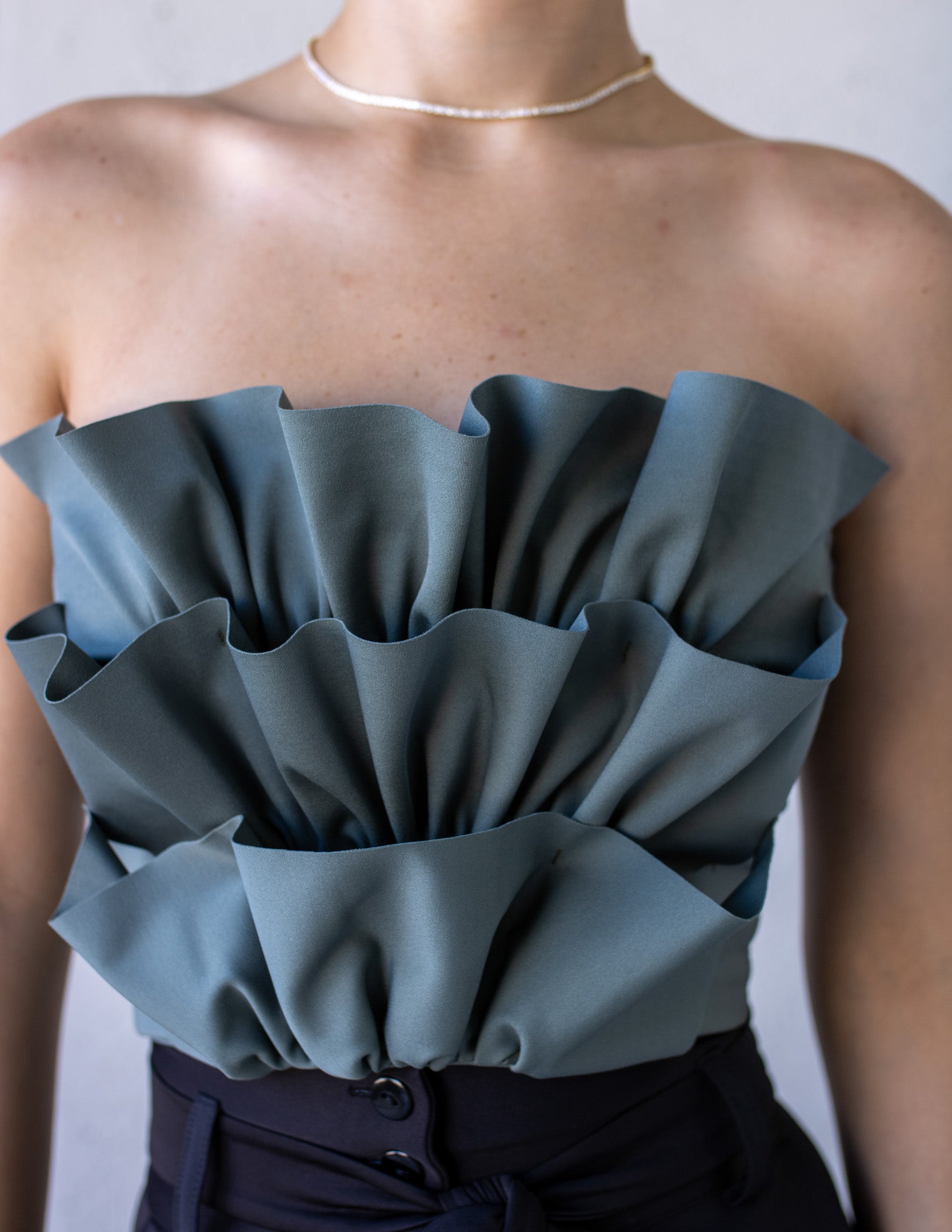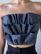 A statement top that combines the structured silhouette of a corset with delicate ruffle detailing. The cropped corset offers a fitted look, while the ruffles add a touch of elegance and playfulness to the design.