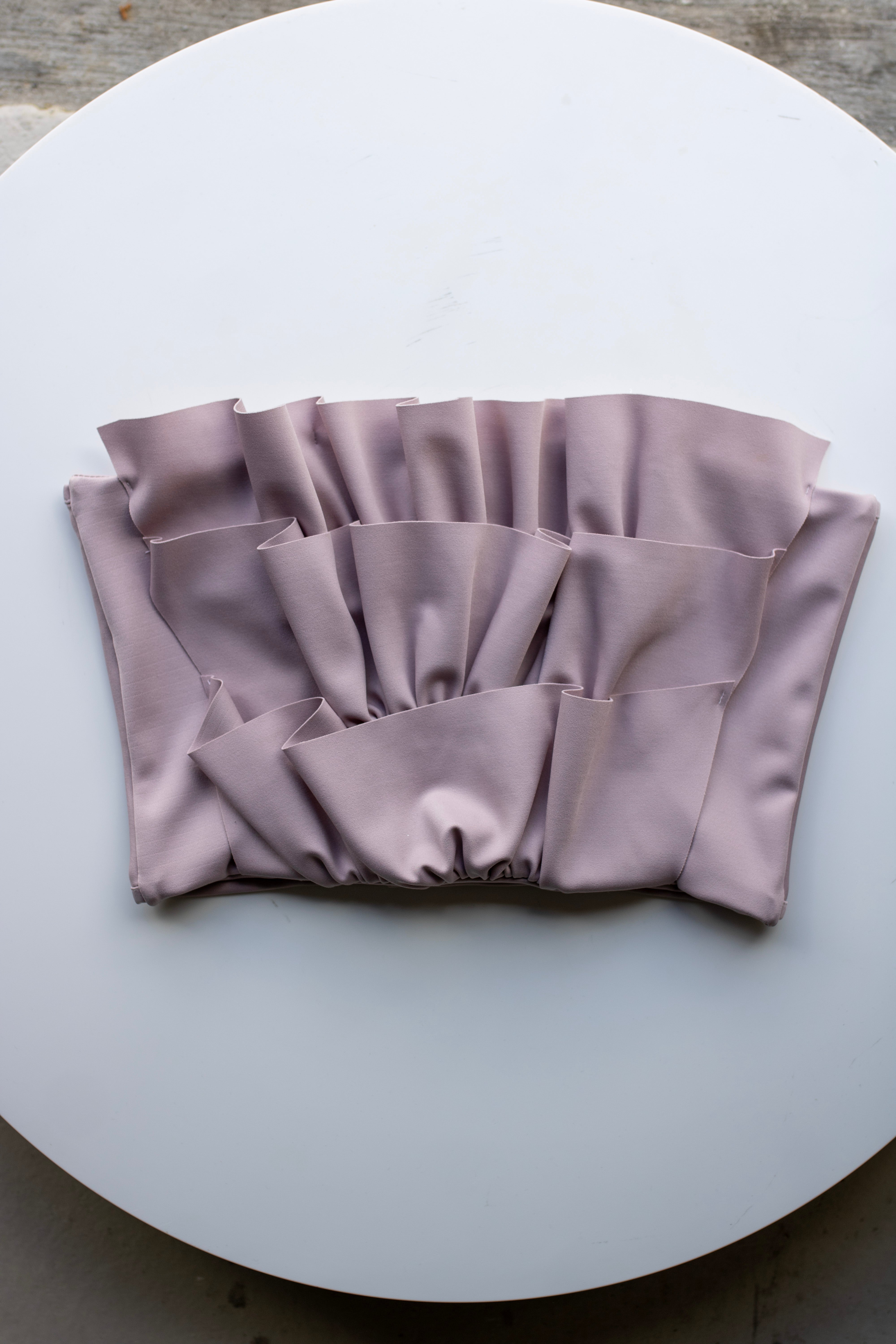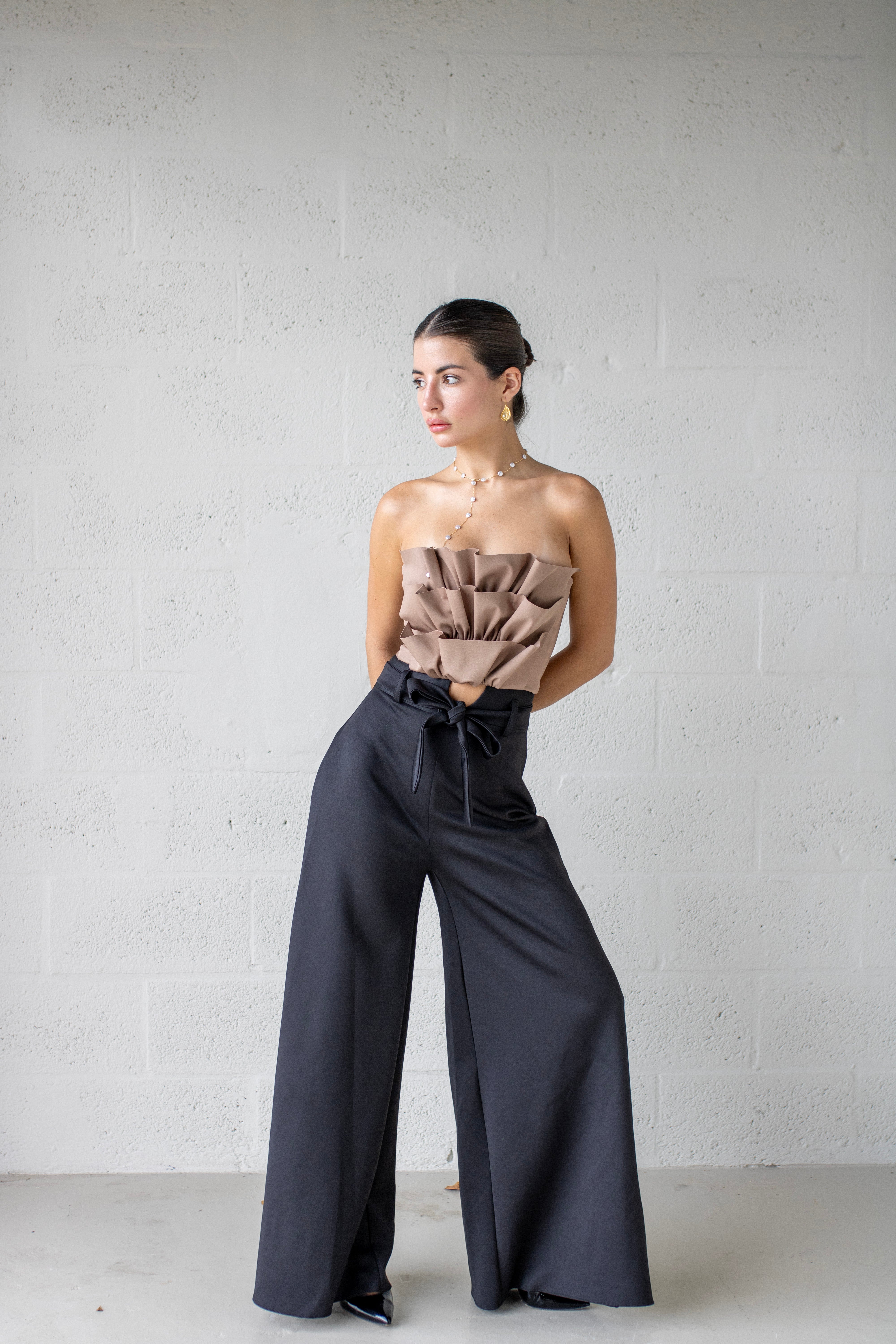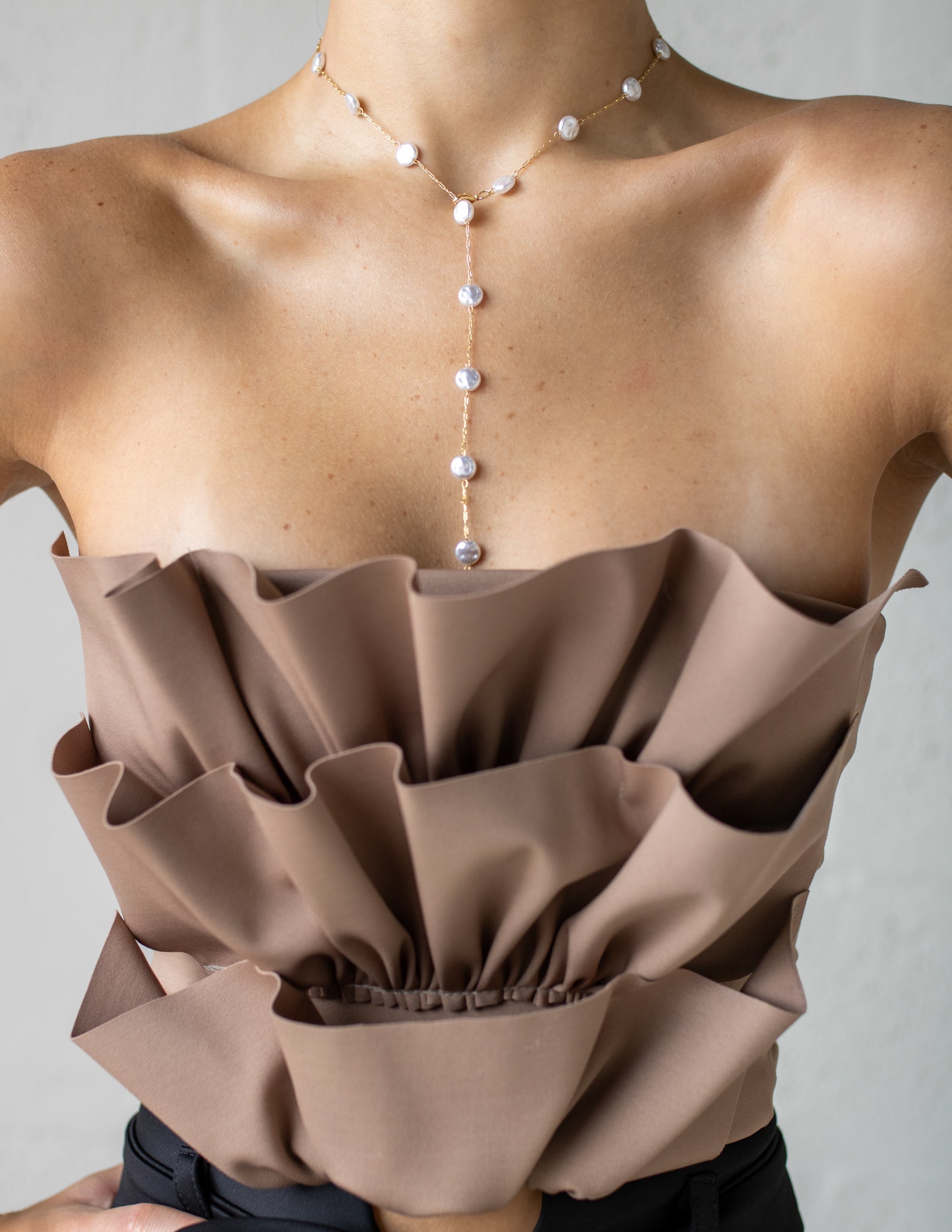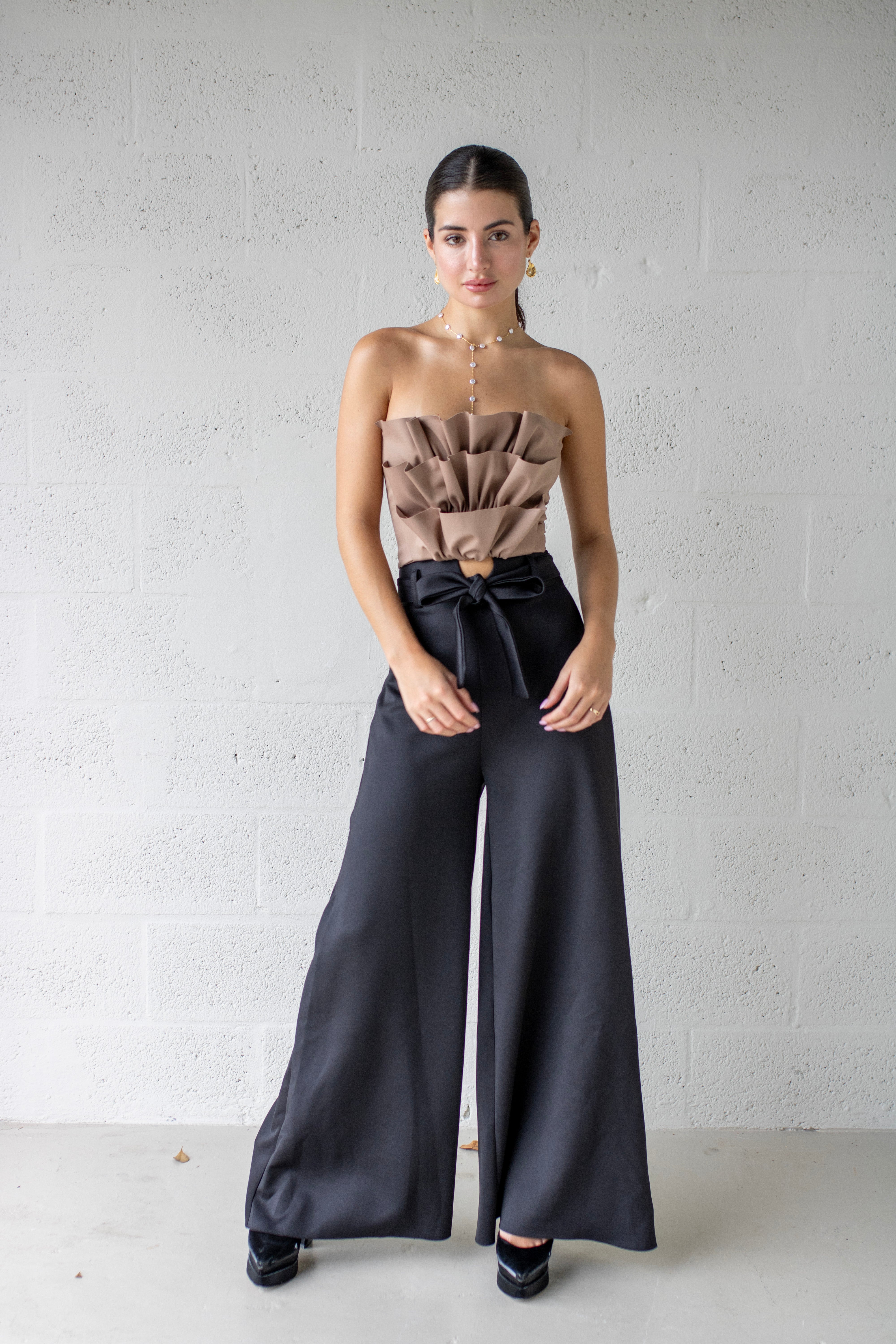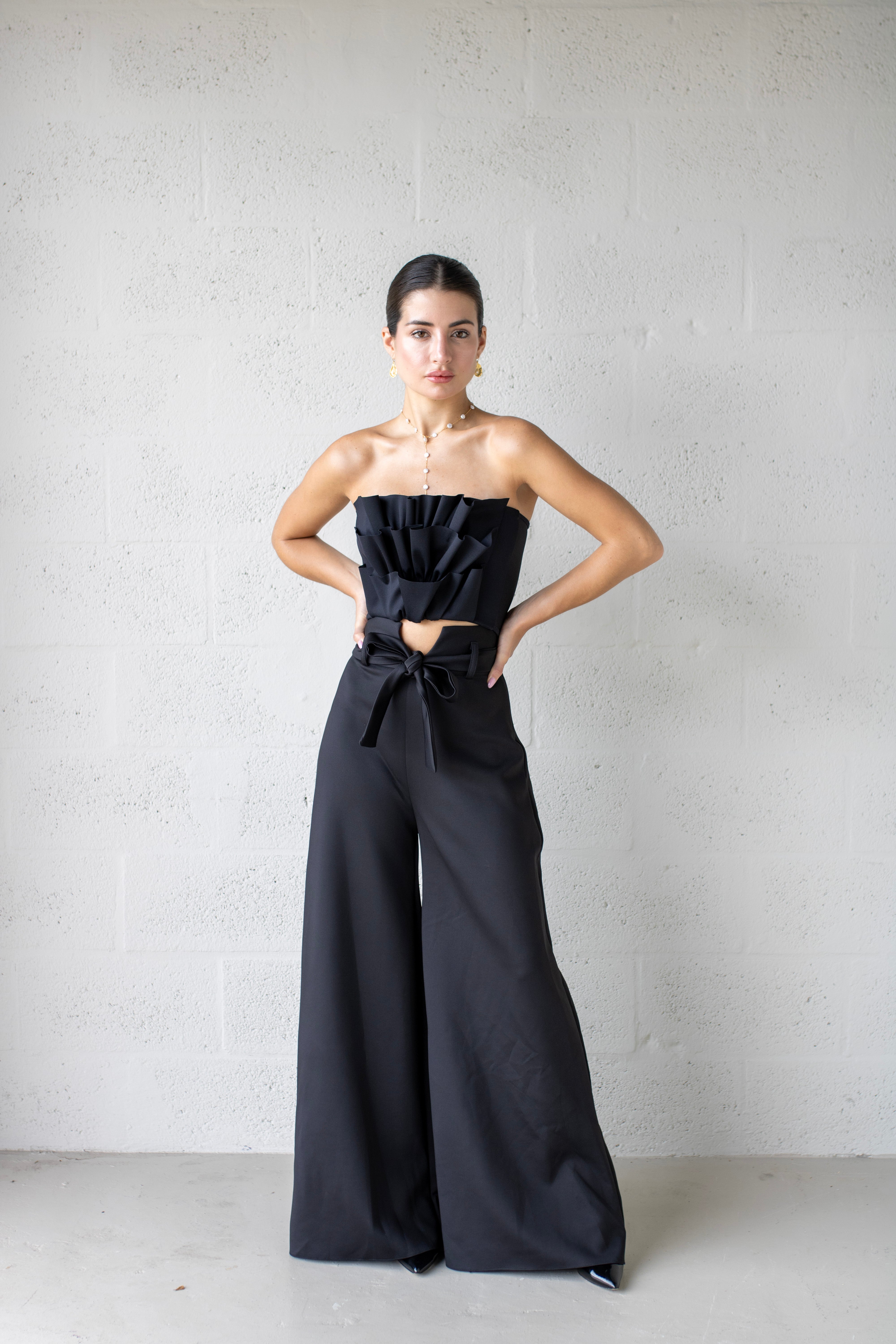 A statement top that combines the structured silhouette of a corset with delicate ruffle detailing. The cropped corset offers a fitted look, while the ruffles add a touch of elegance and playfulness to the design.
