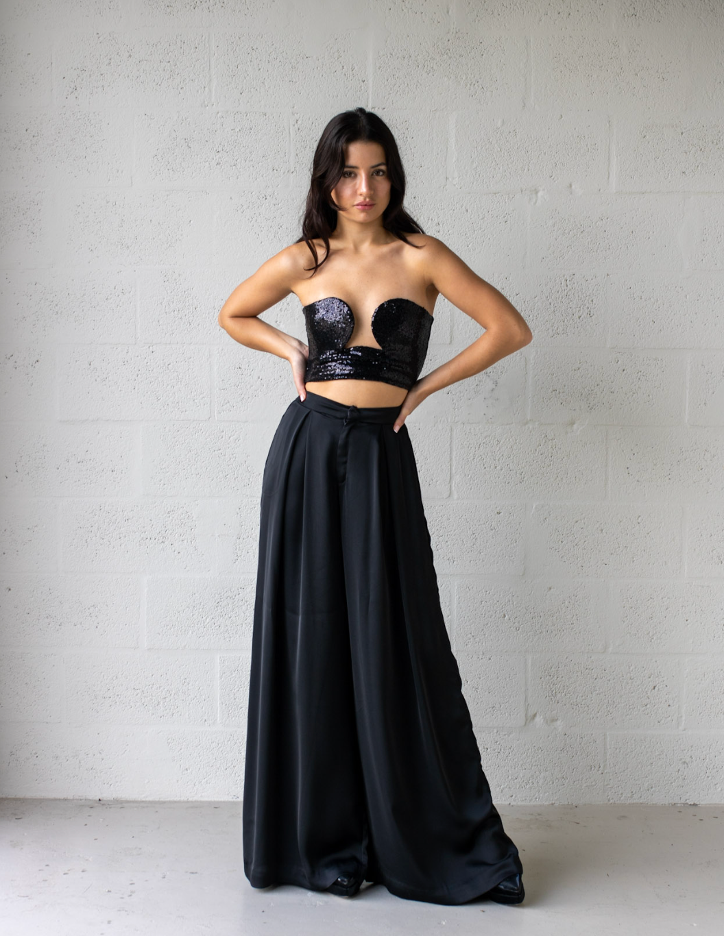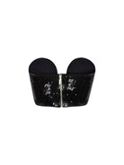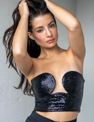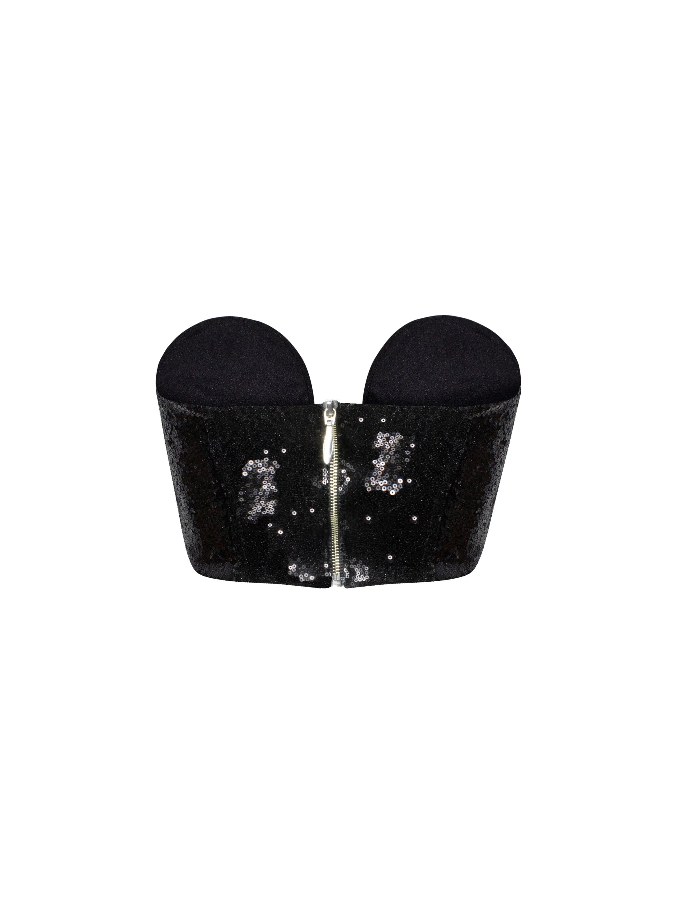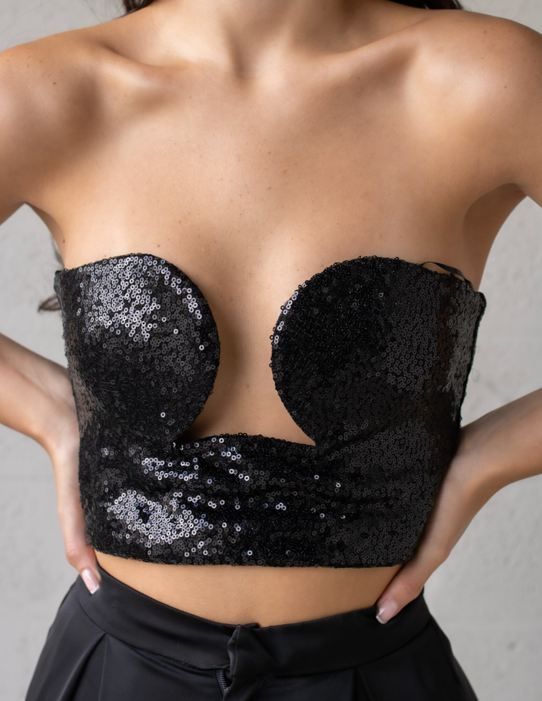 Top with scoop neckline. Silhouette fitted to the bust. Made of elastic sequin fabric. Back zipper closure, neckline with pre-hormed rod. Fully Lined.