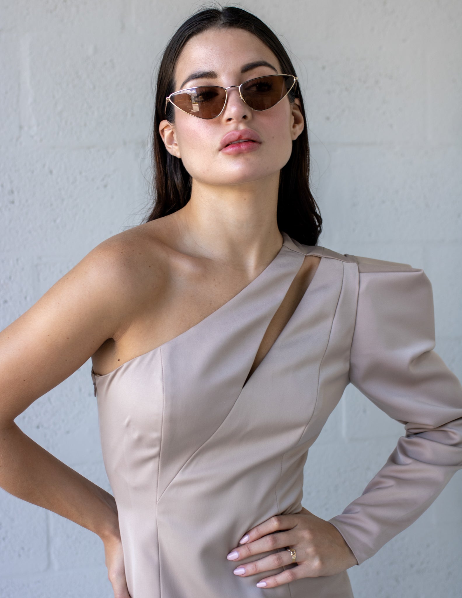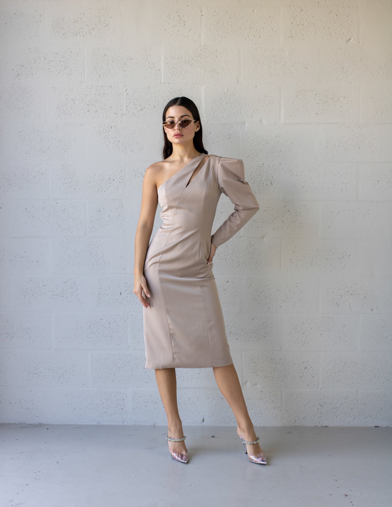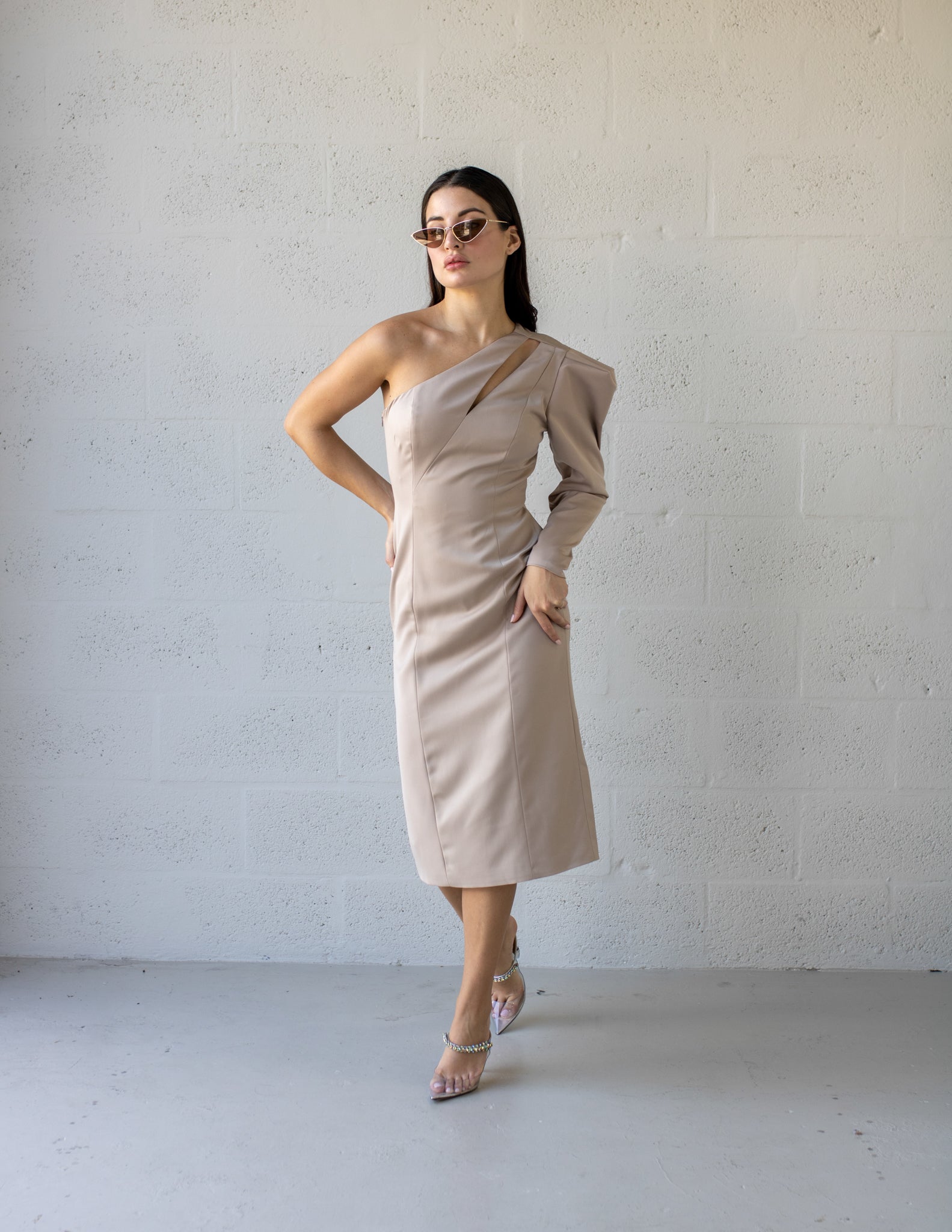 Our one-shoulder-fitted dress hugs the body's contours, creating a flattering and form-fitting silhouette. Its unique and alluring design makes it an excellent choice for formal events and special occasions.