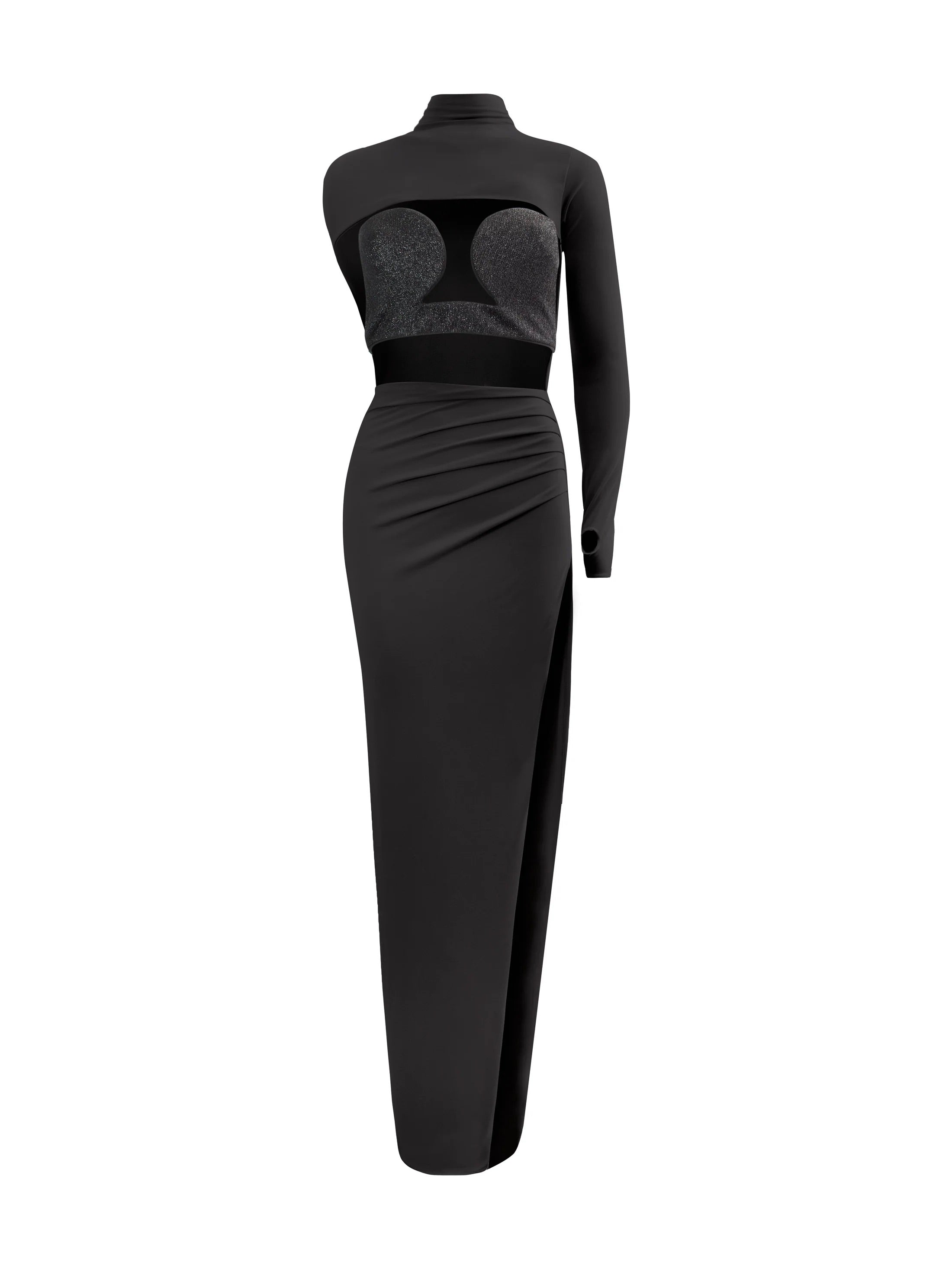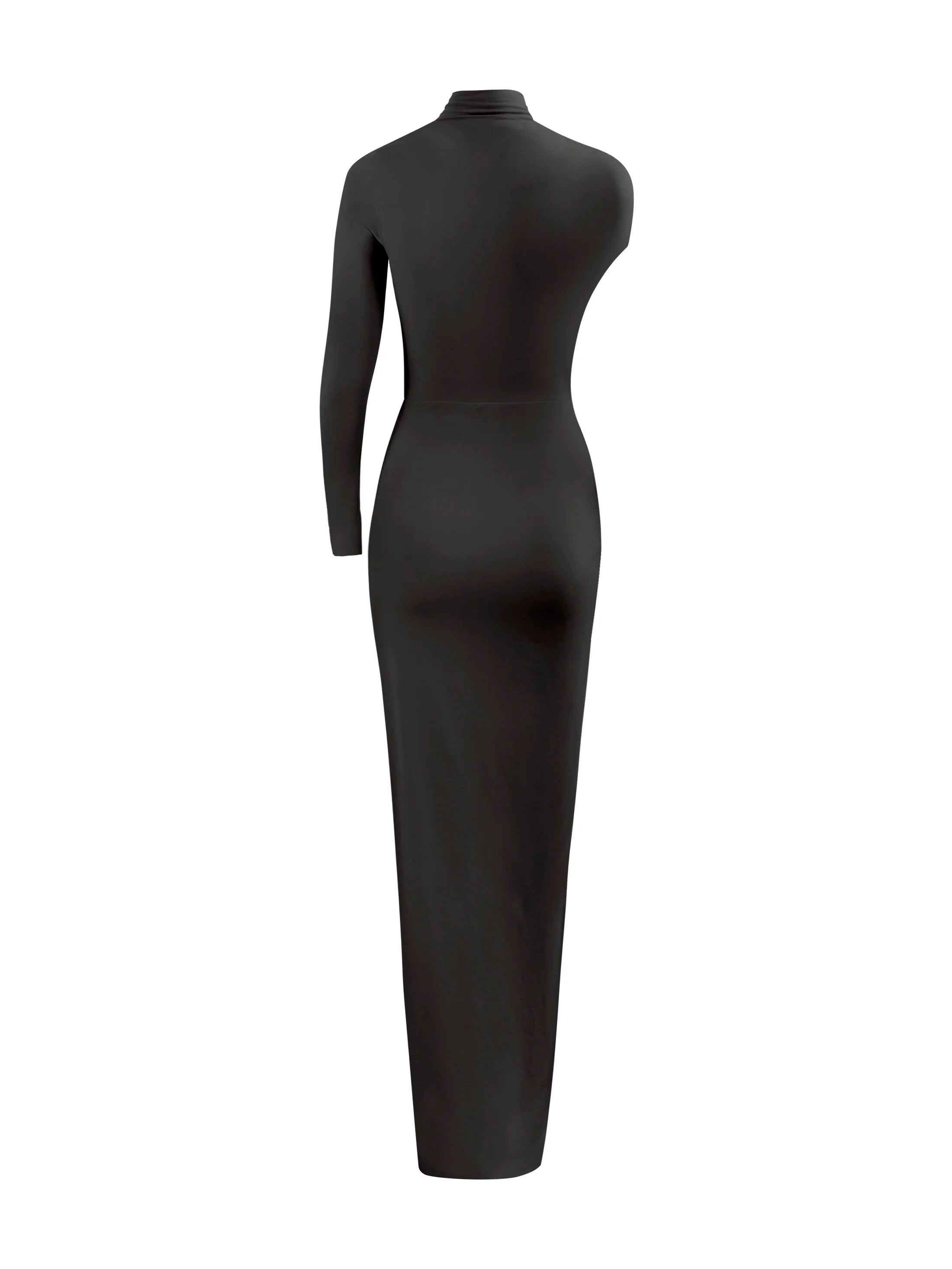Tight-fitting dress with sleeves, turtle neck, side opening, thumb hole on the sleeve, draping on the skirt. The top can be used as a separate piece of the dress.
