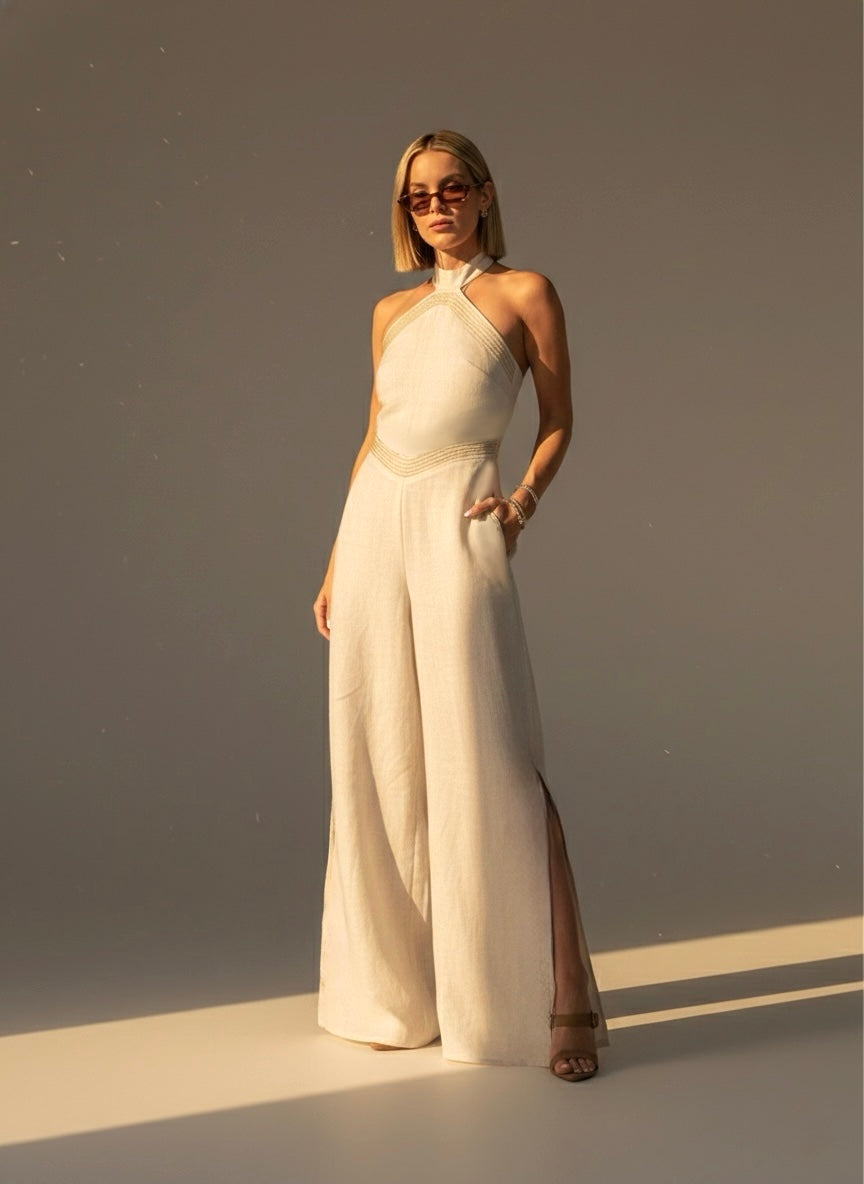 Colombia Moda Exclusive – The Romina Jumpsuit is pure sophistication in motion. With a halter neckline, side slits, and body-skimming lines, it brings effortless allure to summer nights or coastal escapes.