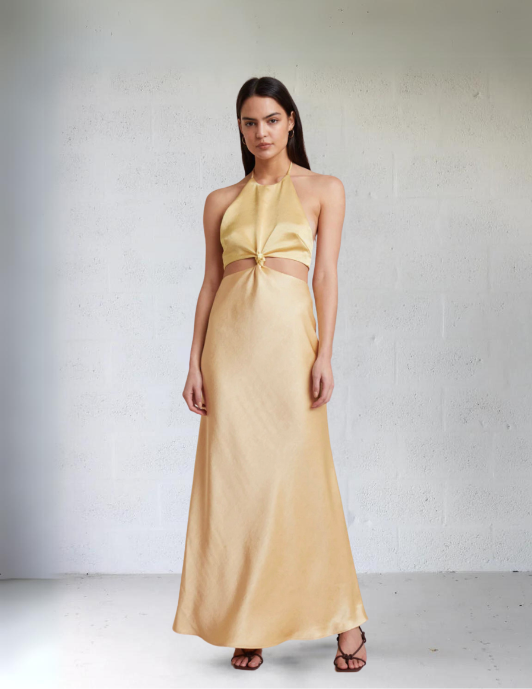 The Carrie Halter Dress is an effortless statement style cut from a fluid satin fabric. The dress features a self-tie halter neck in a flattering bias silhouette with a knotted twist front and underbust cutouts.
