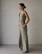Introducing our Gigi Vest, a masterpiece made of 100% linen in a stunning olive green hue. Handcrafted in Peru, it boasts mother of pearl buttons and is exclusively designed for the sophisticated dresser. Experience luxury with this timeless and elegant addition to your wardrobe.