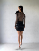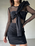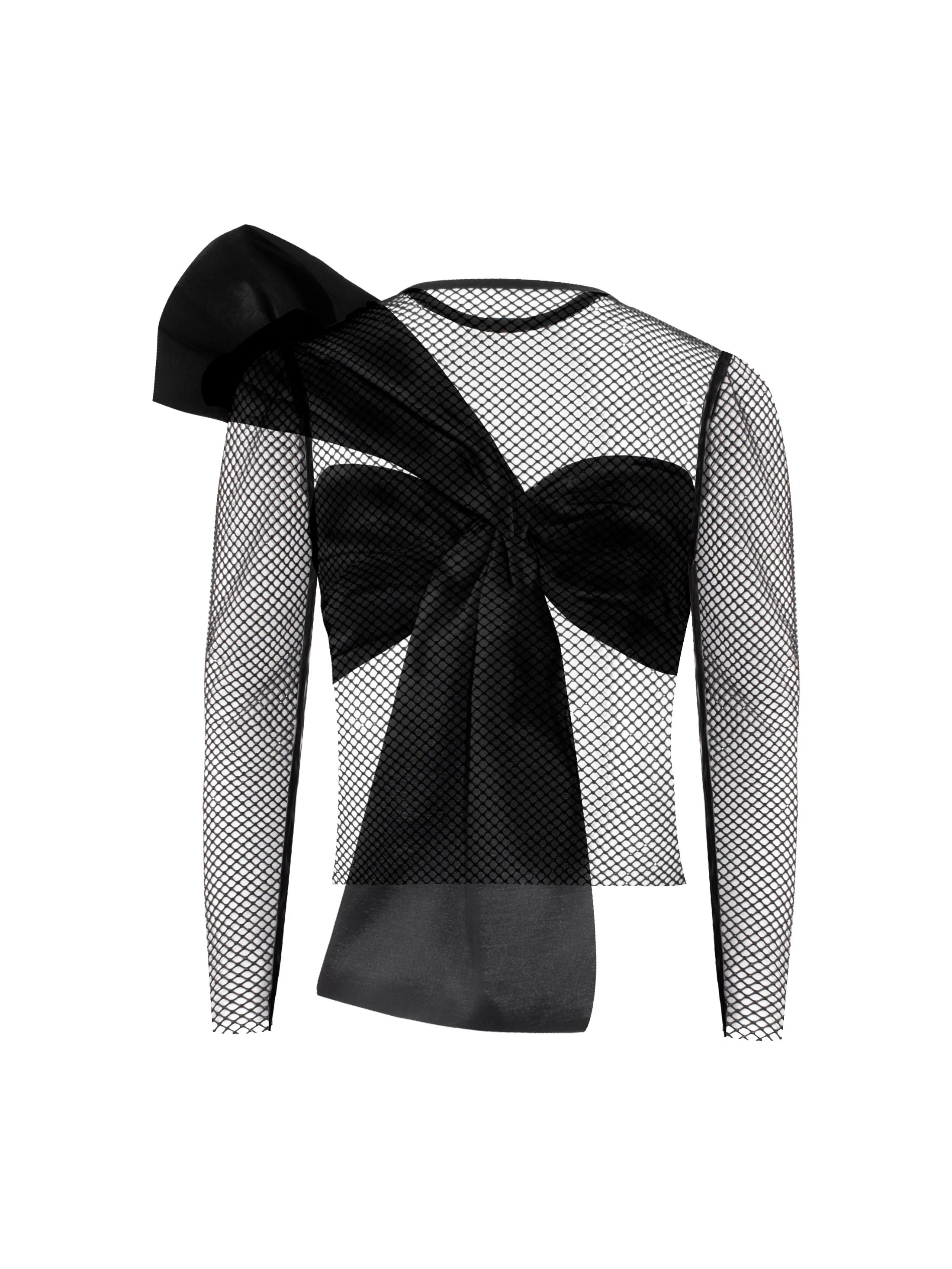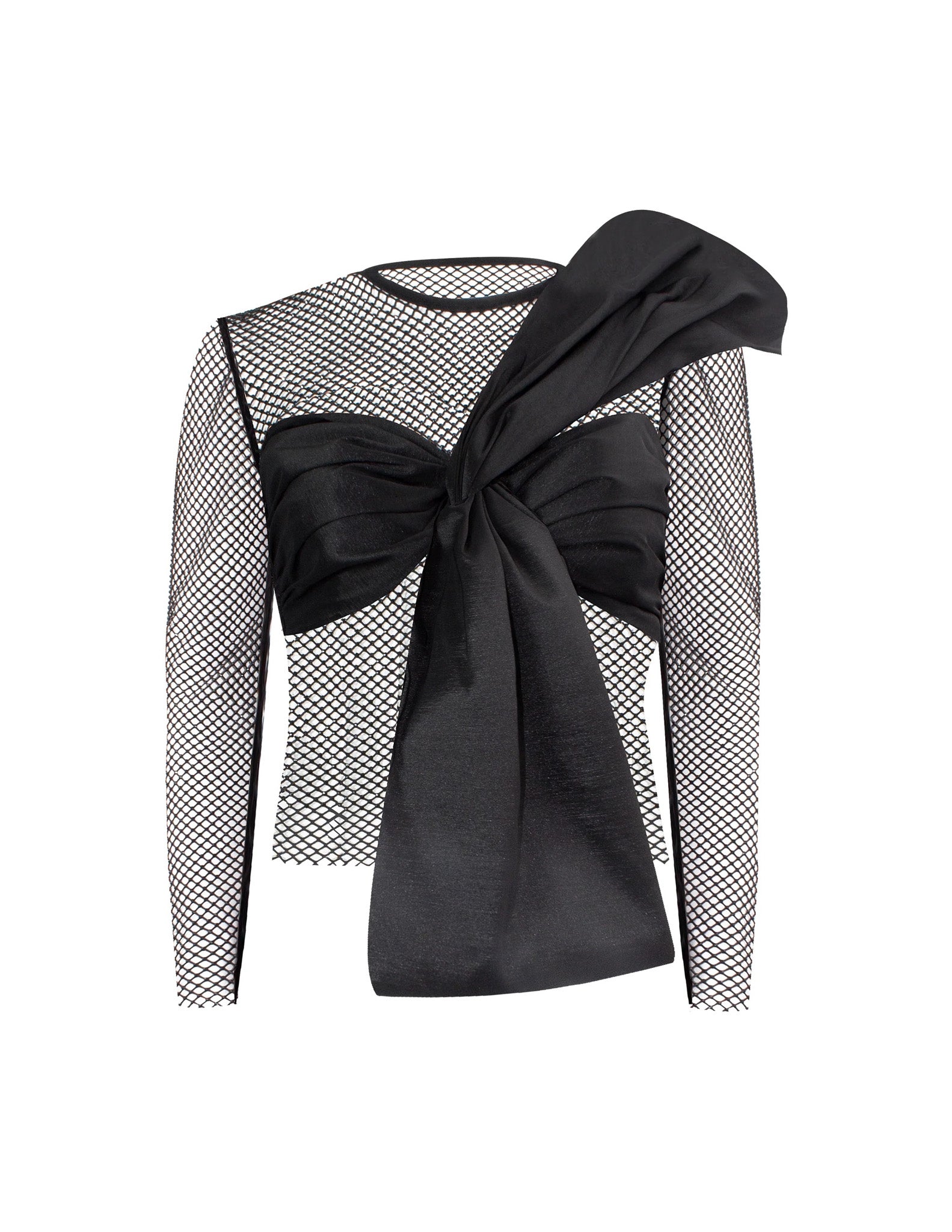 Crystal mesh blouse with long sleeves and taffeta draped bow on the bust area. It has a round neck. open back