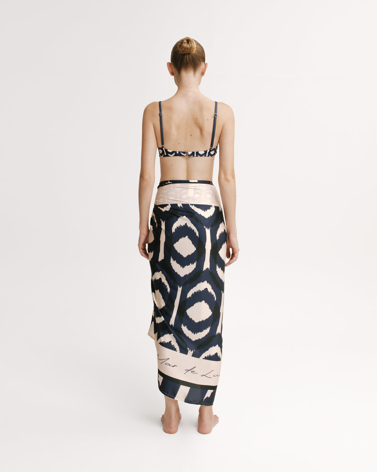 The Aisha Ikat Sarong is a versatile wrap piece featuring an eye-catching navy and cream Ikat pattern. Its lightweight drape makes it easy to tie at the waist for effortless beachside elegance. Wear it as a skirt, a cover-up, or a chic resort accessory to elevate any swim look.