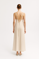Effortlessly chic, this linen maxi dress is the ultimate warm-weather staple. Designed with a fluid silhouette, it features a flattering V-neckline and an open back detail that makes a statement from every angle. Nude-toned plastic rings elevate the straps with a modern twist, while the delicate tie-back detail adds just the right touch of femininity.