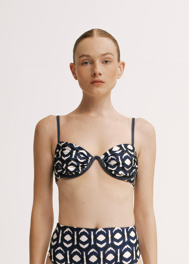 A chic bikini top featuring a sculpted, underwire-inspired shape that enhances the neckline with a modern touch. The adjustable straps offer a comfortable fit while the bold print adds a striking finish. Perfect for mixing, matching, and making a statement by the water.
