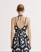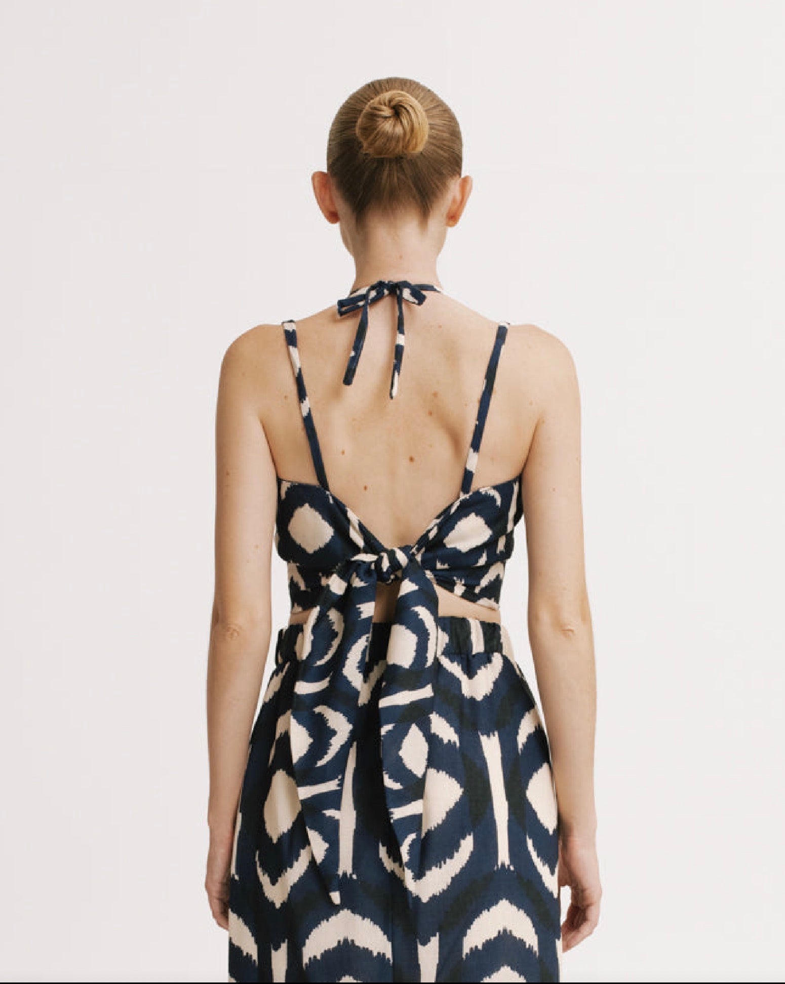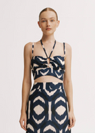 This crop top features a striking Ikat print with a modern, sculpted silhouette. It includes a gathered front detail with a small keyhole, slim straps, and a halter tie that adds an elevated touch. The open-back design with a wraparound tie creates a feminine, adjustable fit—perfect for pairing with its matching skirt or high-waisted separates.