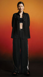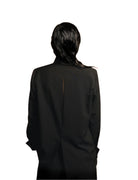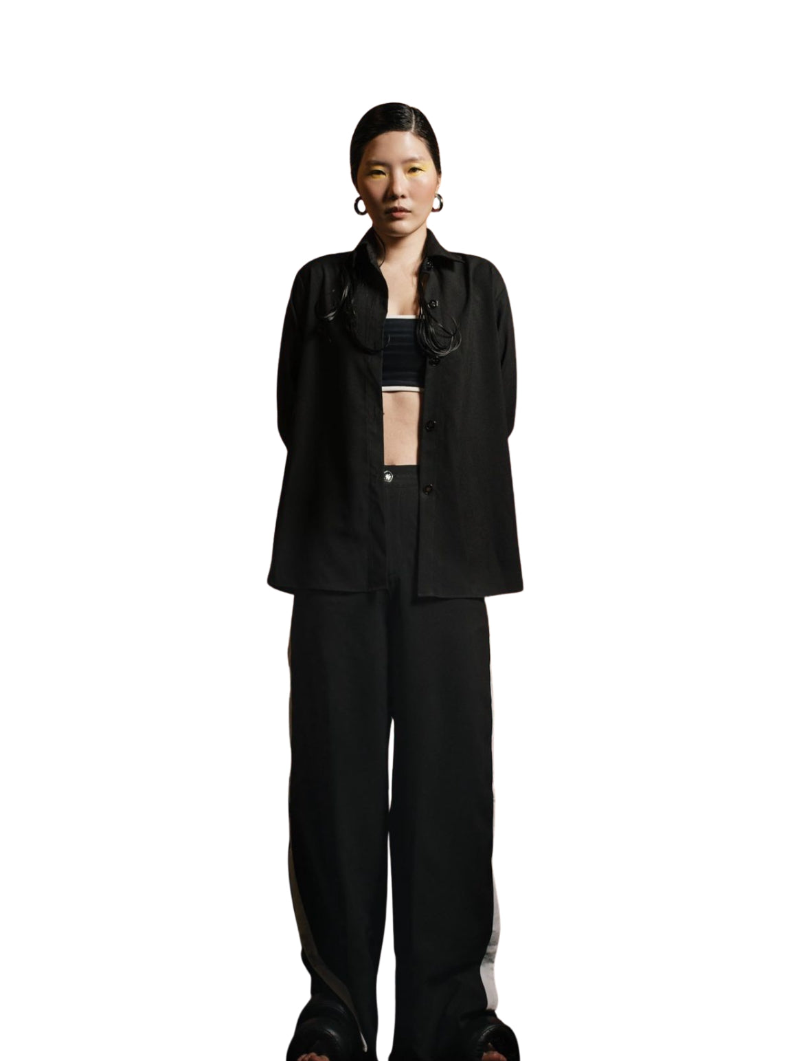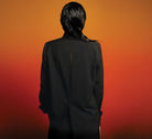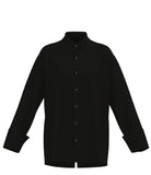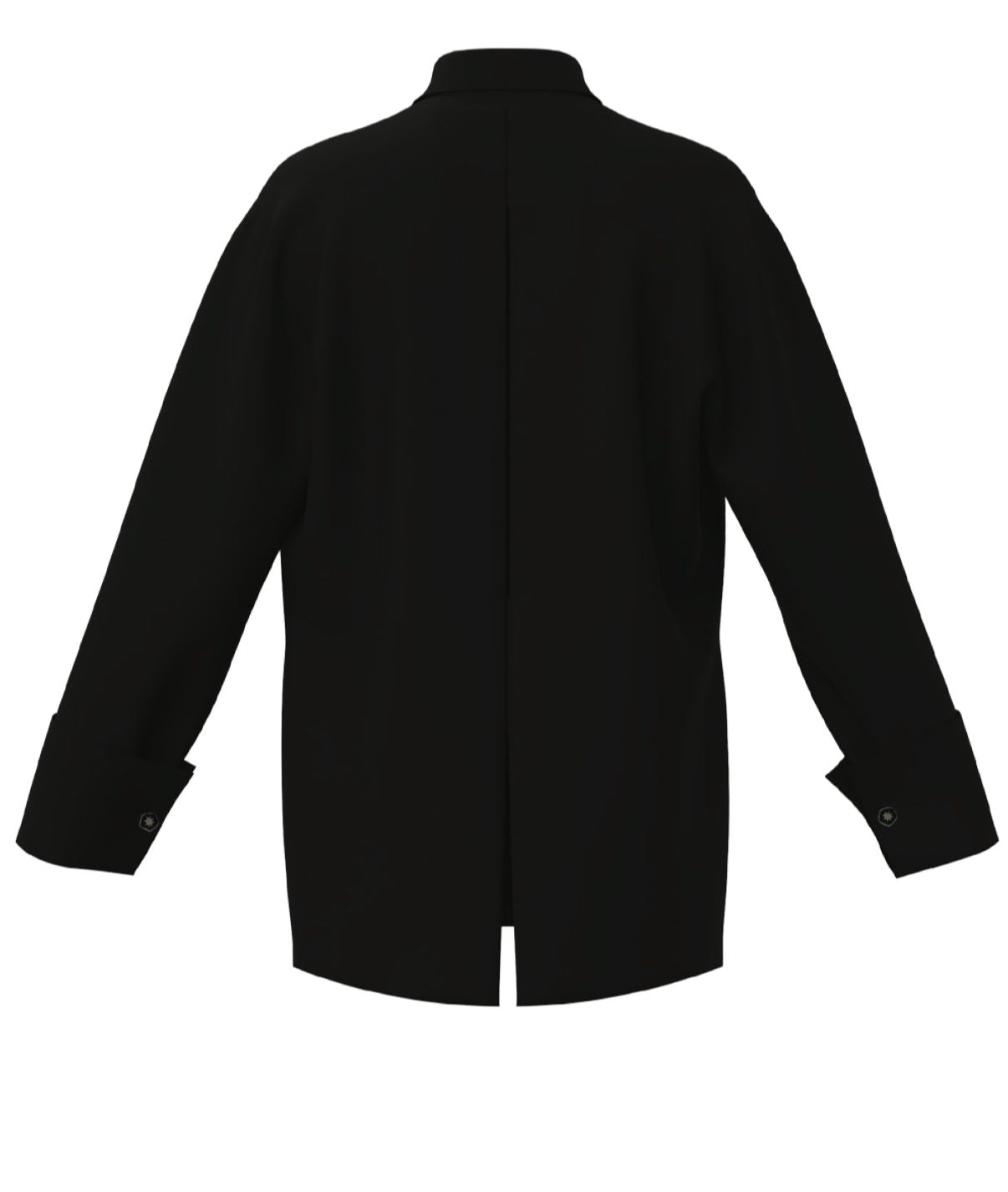 Blouse featuring a semi-wide shirt collar and a visible button placket with branded metallic buttons. Designed with a relaxed, oversized fit and long sleeves for an effortlessly polished look.