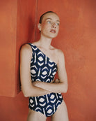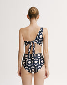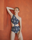 A striking one-shoulder swimsuit featuring a bold Ikat pattern, a front ring detail with a subtle cutout, and a sculpting high-waist silhouette. The adjustable tie-back adds support while keeping the look modern and asymmetric.