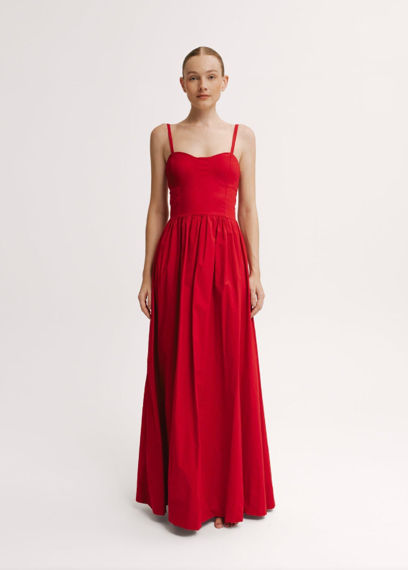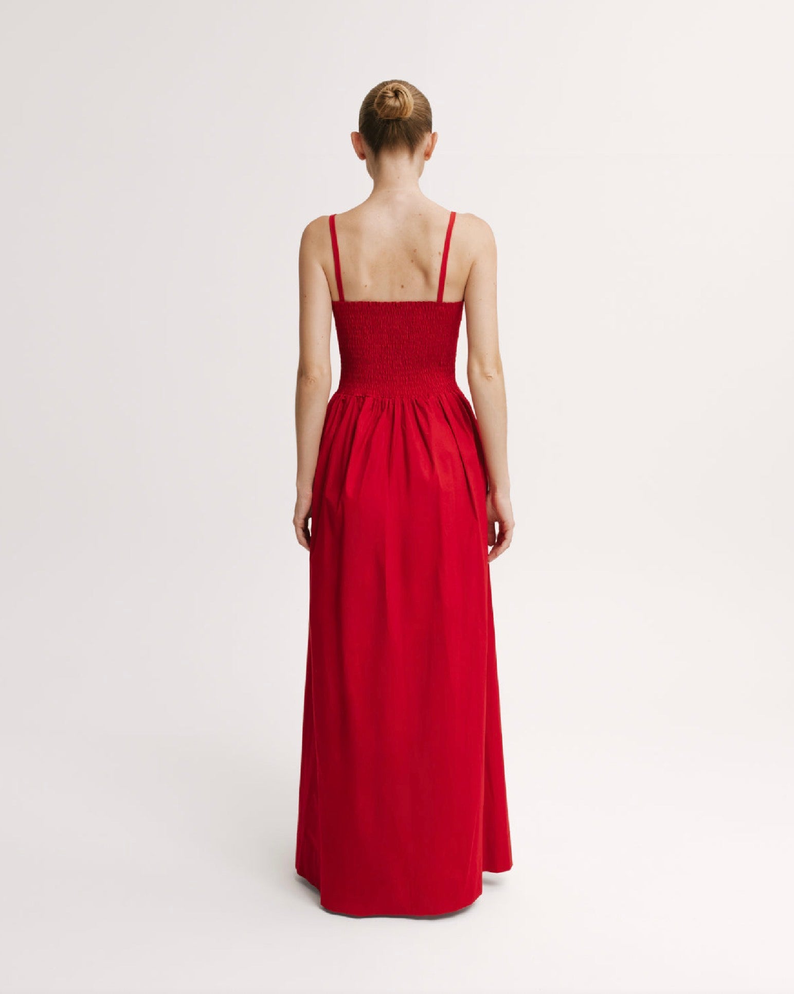 A stunning floor-length dress designed to make a statement. The fitted bodice and delicate straps highlight the neckline, while the gathered skirt adds graceful movement and volume. Its vibrant color and timeless silhouette create a bold, elegant look perfect for any special occasion.