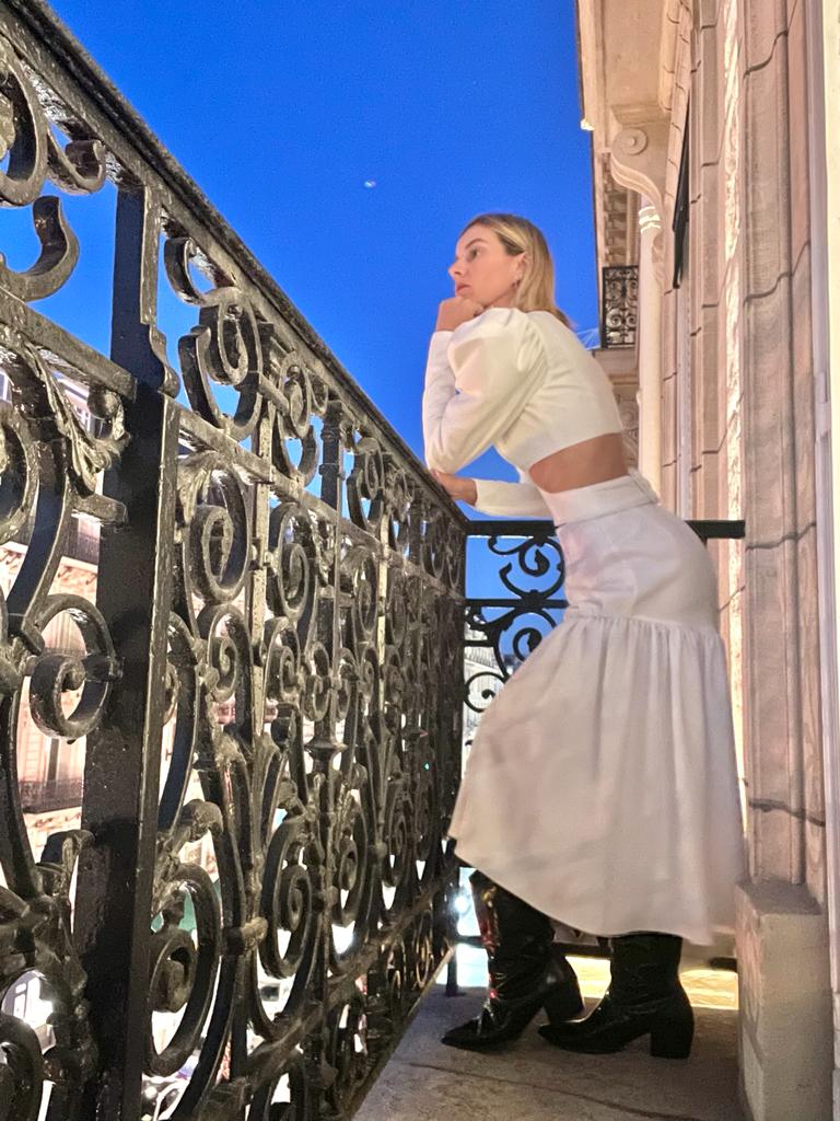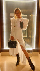 Our Flor de Laguna asymmetrical high waist skirt features front draping and central opening.