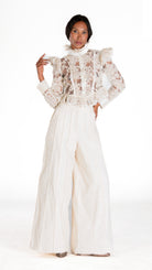 Rooted in tradition, elevated by design. This wide-leg palazzo features a rich fusion of textured fabric and delicate lace, creating a flowing silhouette that evokes ancestral beauty and timeless grace. A poetic balance between structure and softness, past and present.