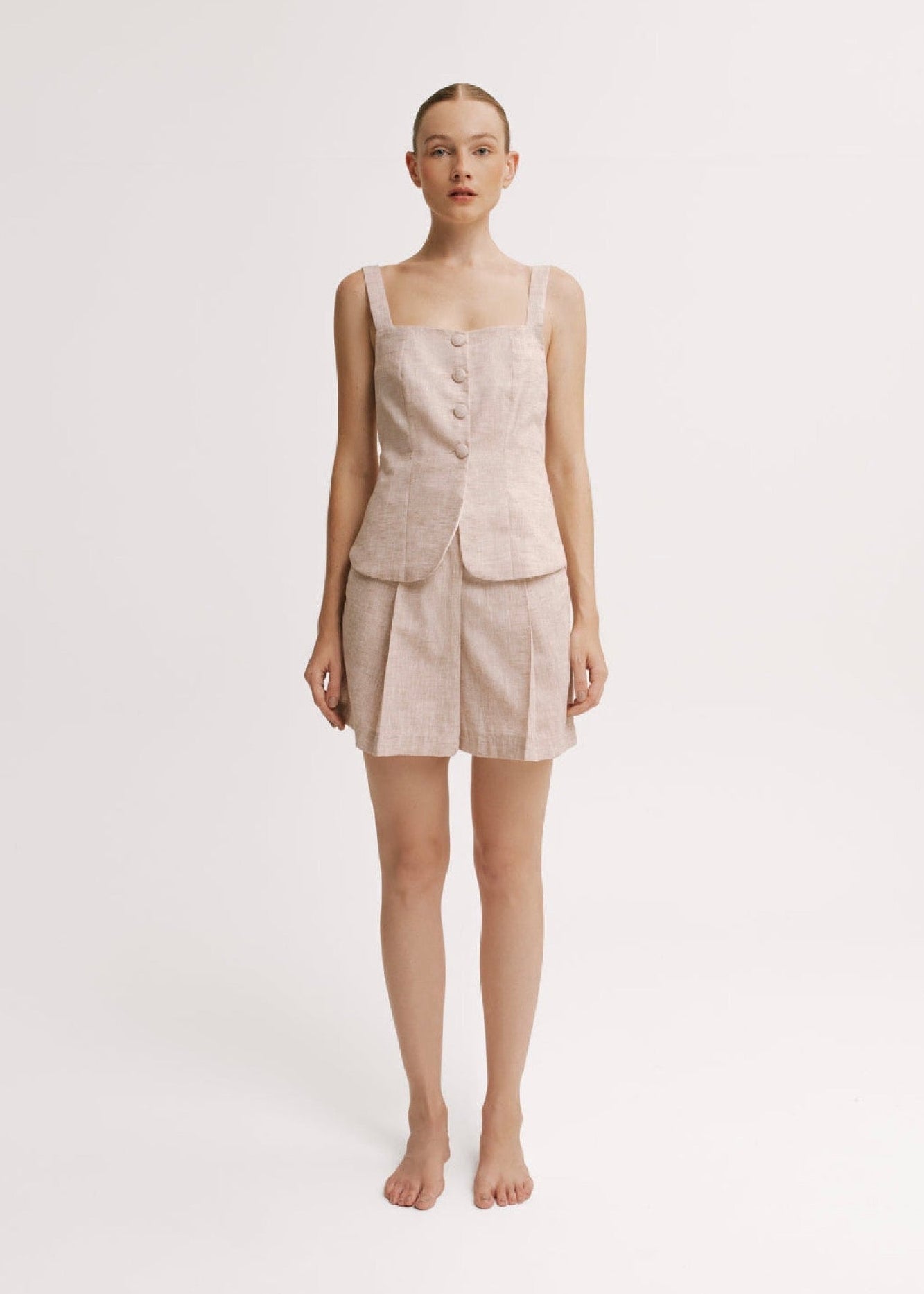 Tailored with a refined, structured shape, the Tea Habano Shorts feature front pleats that add movement and a polished finish. Their high-rise fit and clean lines make them a versatile piece—perfect for pairing with the matching blouse or styling effortlessly on their own for a fresh, elevated look.