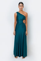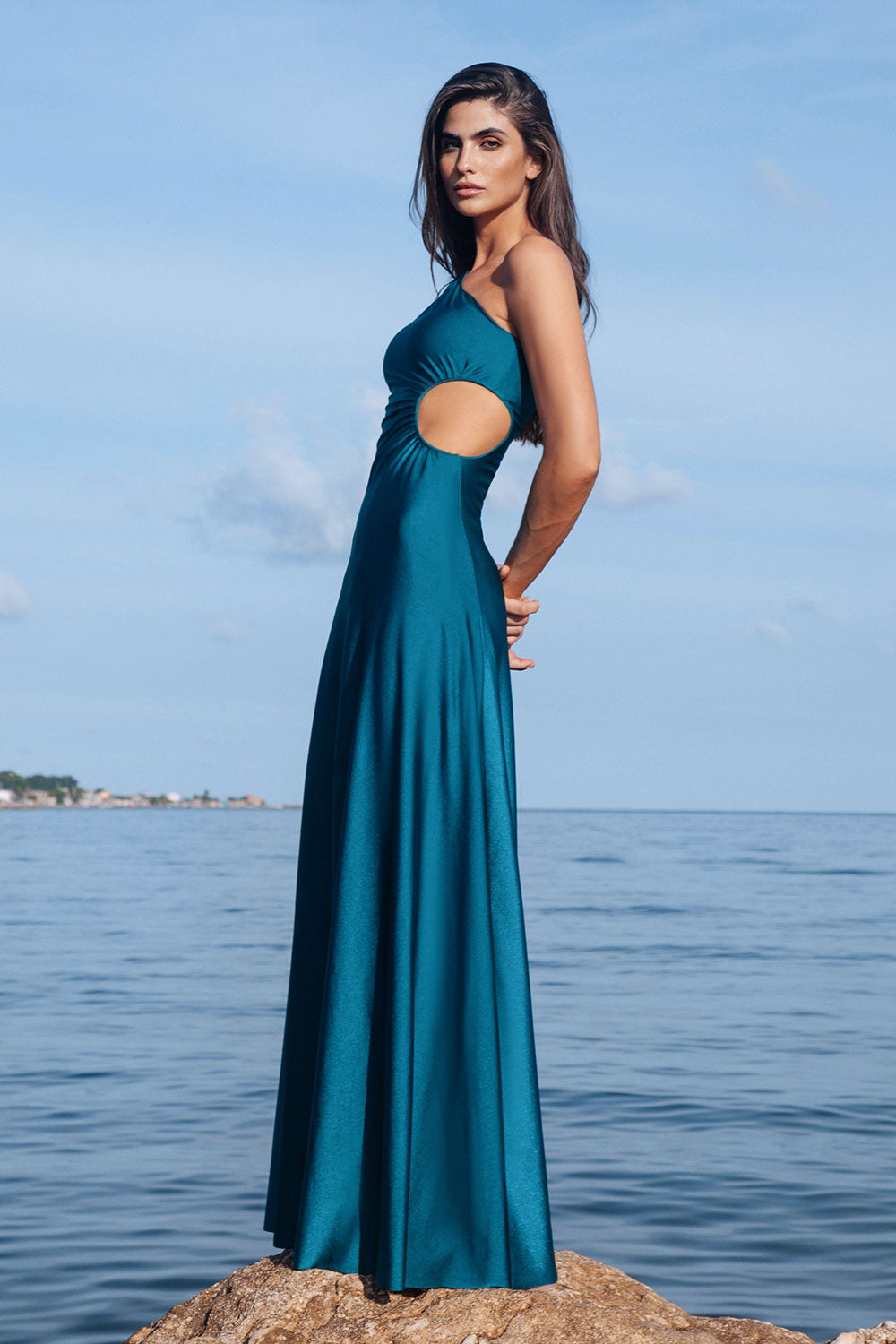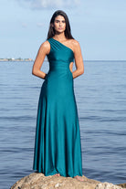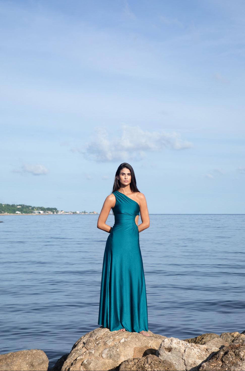 The Aqua Muse Dress is a sleek and stylish teal one-shoulder dress with a relaxed yet elegant vibe. The fabric flows nicely, and the side cut-out gives it a fun, modern touch. It’s a great choice for a night out, a wedding, or any dressy event where you want to look put together without trying too hard. Pair it with simple heels and dainty jewelry for a classy look, or throw on some chunky accessories and a messy bun for a more effortless feel. Either way, it’s an easy, go-to dress that makes a statement on its own.