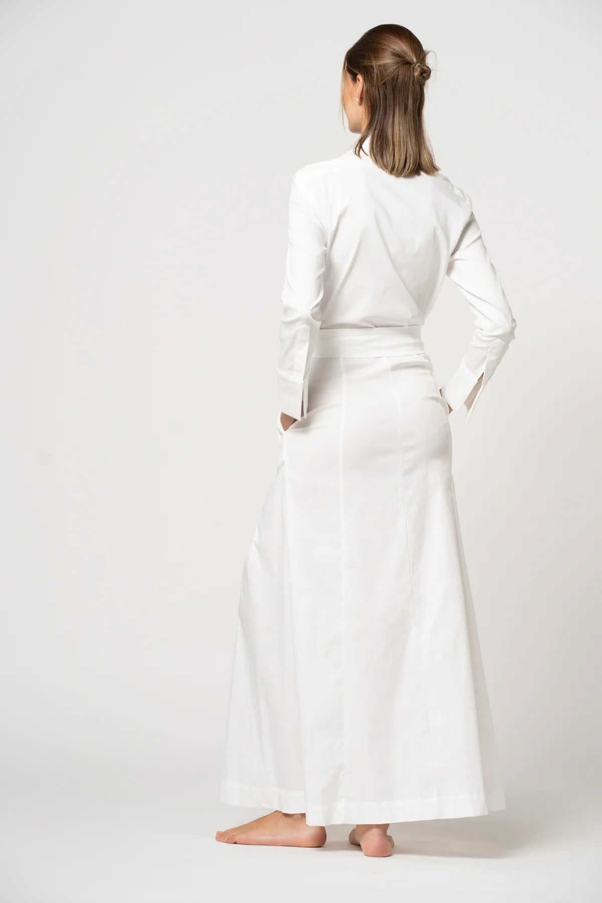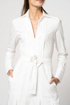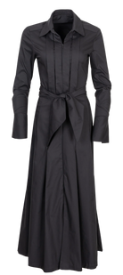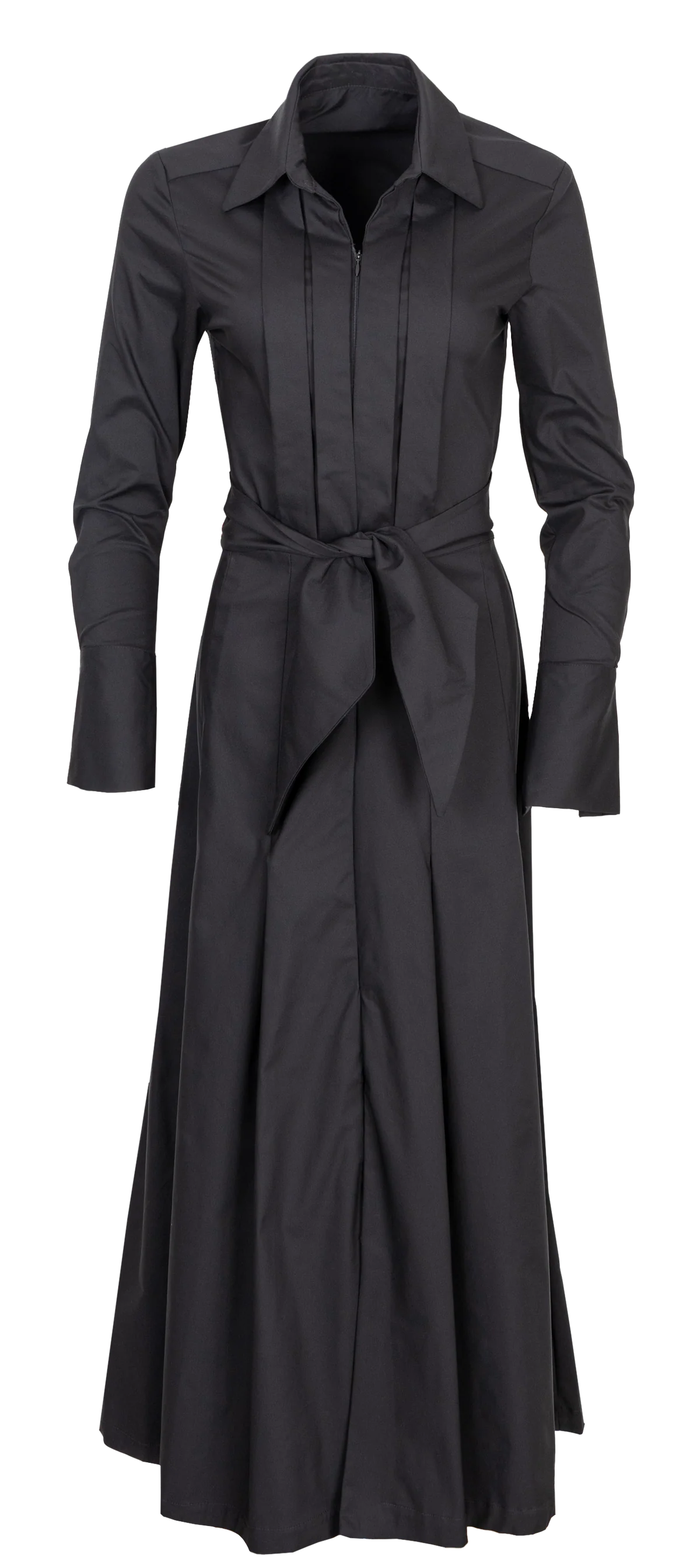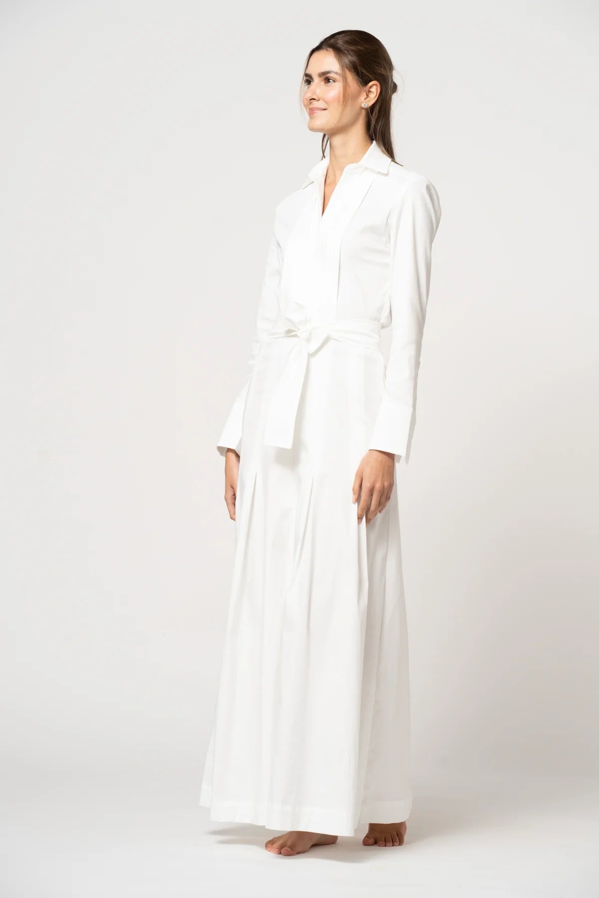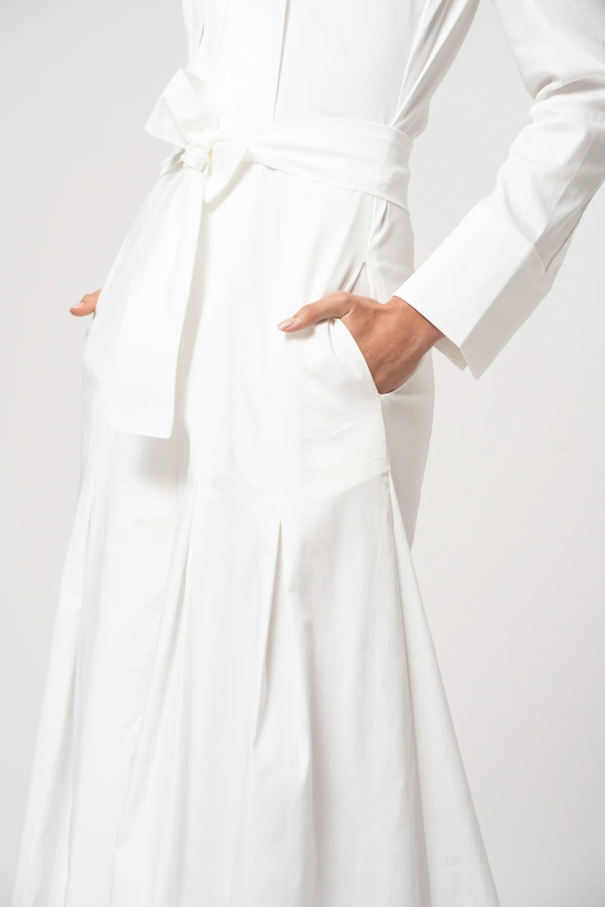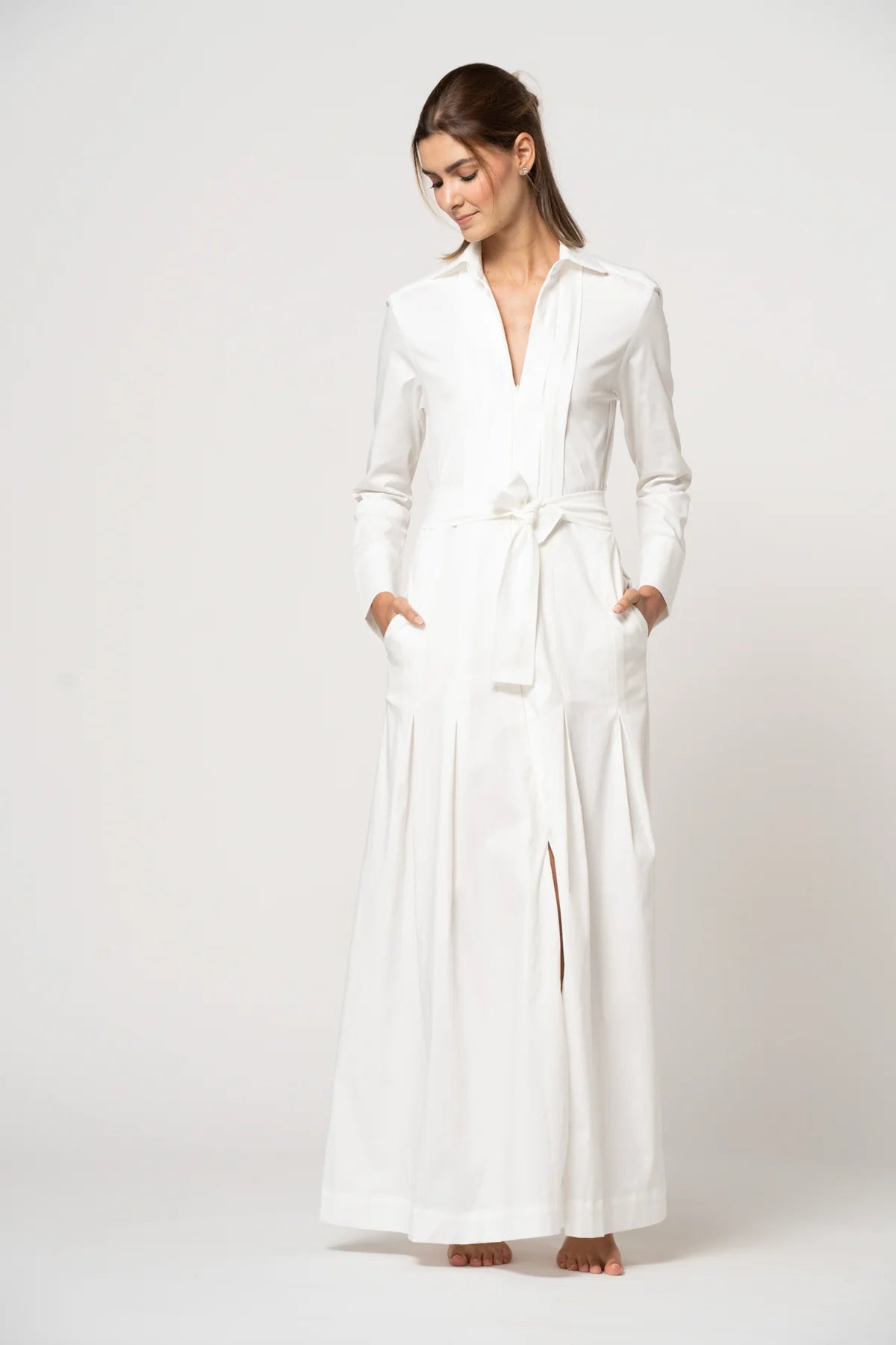 The Bruma Dress captures effortless sophistication through its timeless shirt-dress silhouette. Featuring a pointed collar, deep V neckline, and long sleeves, it balances structure and fluidity with ease. The detachable waist belt accentuates the figure, while discreet side pockets and a subtle front slit add comfort and movement. Crafted with clean lines and a flowing drape, it’s a versatile piece designed to transition seamlessly from day to evening.