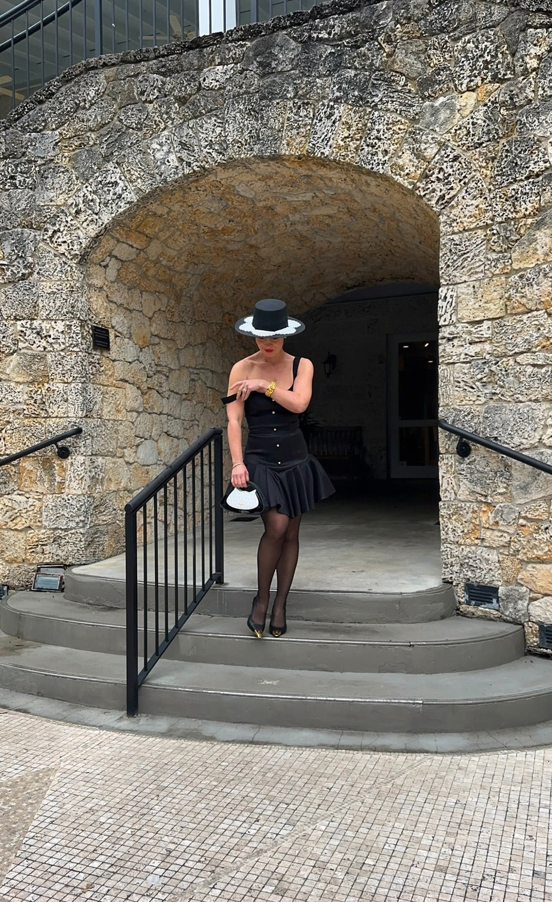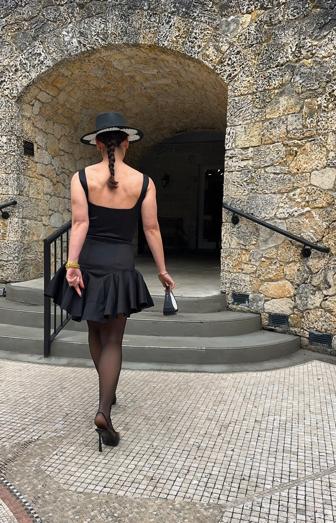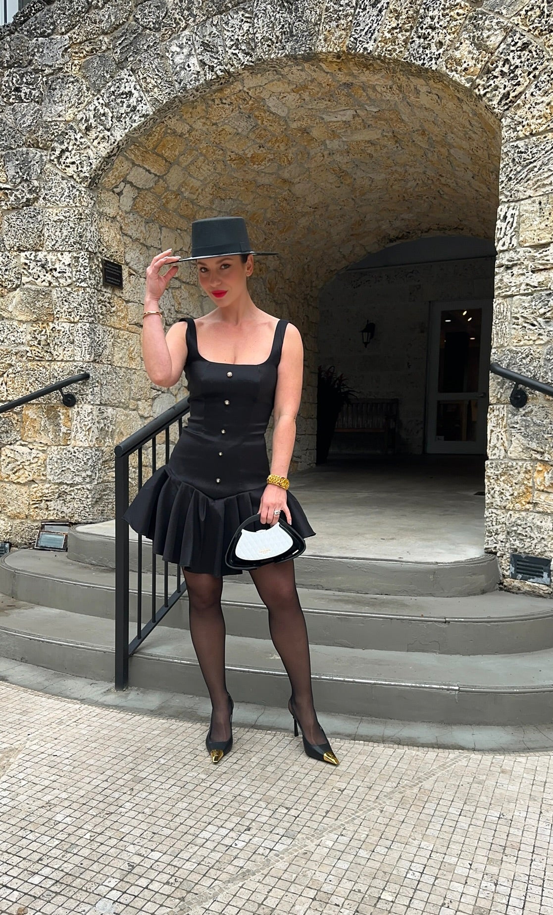 The Calista is your sublime little black dress with a playful twist. Features a square neckline, thin straps, drop waist with buttons lining the front of the body, and a flowy mini skirt.