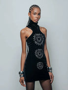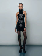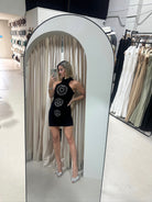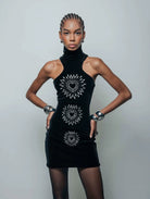 Minimal drama, maximum impact. The velves Europa Dress stuns in sleek black with an embroidered abstract floral detail — your go-to piece for modern nights out.