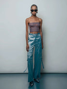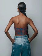 A cropped corset-style top in embroidered pied de poule in blue Wallis, featuring a straight neckline and a seamless cup design. A nickel separating zipper at the center back adds structure and ease. A bold and sensual piece to add a provocative touch to any look.
