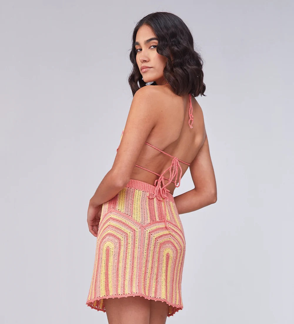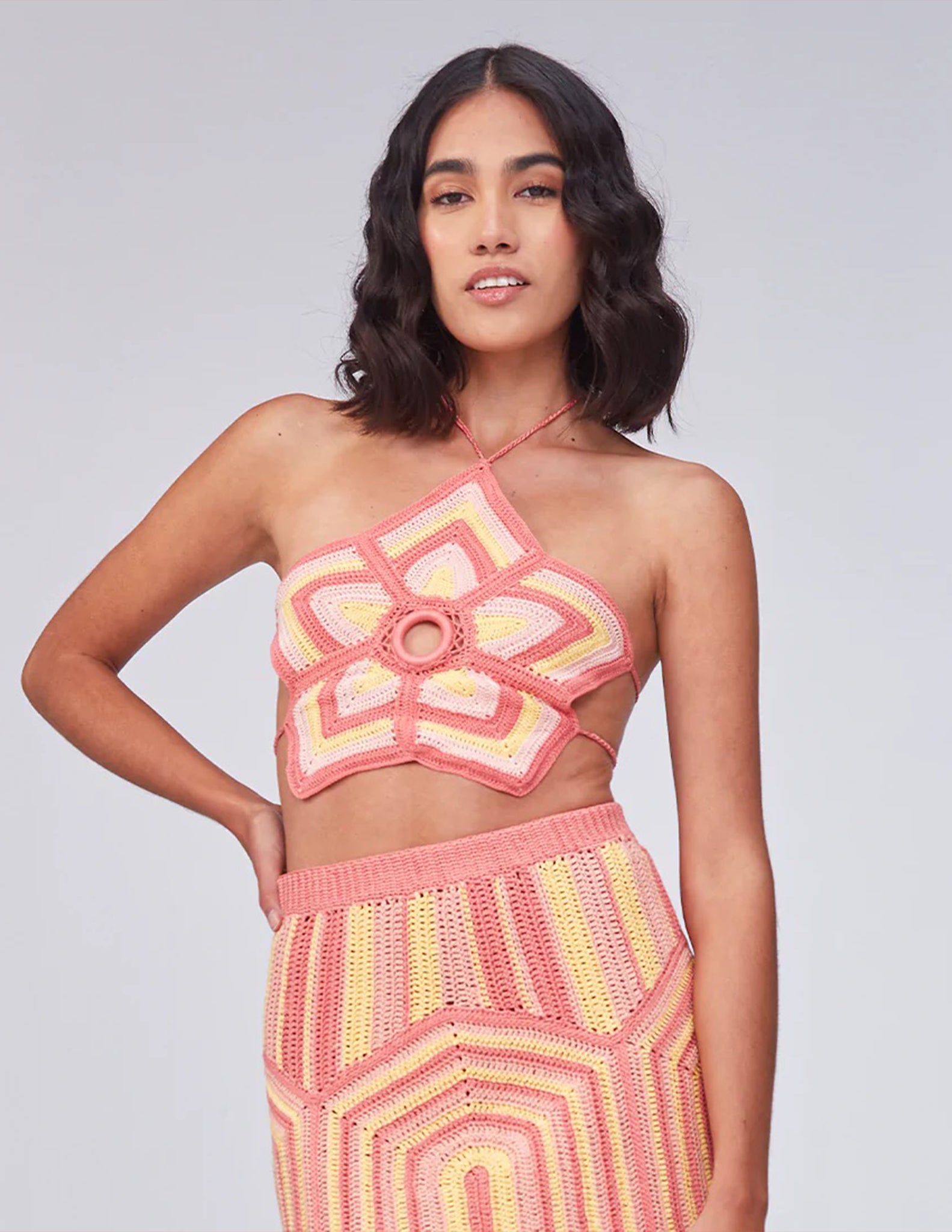 Look good online, will look been better on you! We know you will love our new set. Hannah Knitted Multicolor is a flower-shaped top made with crochet. Produced in a sustainable factory and handmade by Peruvian artisans.