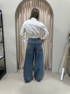 A modern twist on classic denim. Featuring a high-rise fit and exaggerated curved leg, these jeans create a bold yet effortless silhouette. Made from 100% rigid cotton for that perfect vintage feel. Dress them up with heels or keep it casual with sneakers.