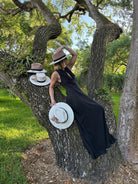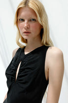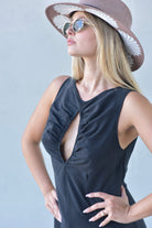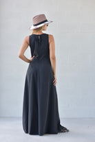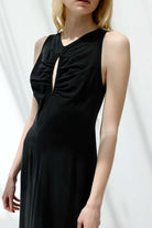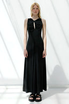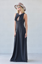 Make a statement with the Lina Dress, a striking blend of sophistication and effortless allure. This floor-length black dress features a flowing silhouette that moves gracefully with every step, while the gathered keyhole neckline adds a touch of intrigue and femininity. Crafted from luxurious, breathable fabric, it drapes beautifully on the body for a flattering and refined fit.