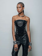 A strapless corset and our latest iconic piece, designed to pair effortlessly with both high and low-rise silhouettes. Featuring a sweetheart neckline, anatomical cuts, and an internal boned structure that sculpts and defines the waist, it celebrates feminine form with bold precision. metal buckles and our CF CONSTELLATION, embroidered in silver in the center, give it its untamed rockstar character, typical of CF's stage presence.