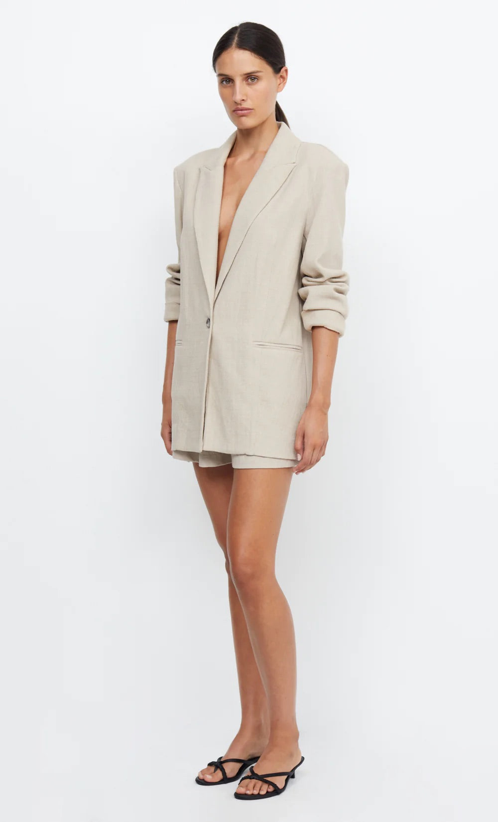 The Manon Blazer is a single breast style cut in a relaxed and oversized silhouette. The blazer features low profile shoulder pads, a notched wide lapel, double welt pockets, single vent at centre back and a self waist tie. Styled with our Manon Short.