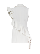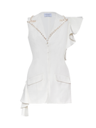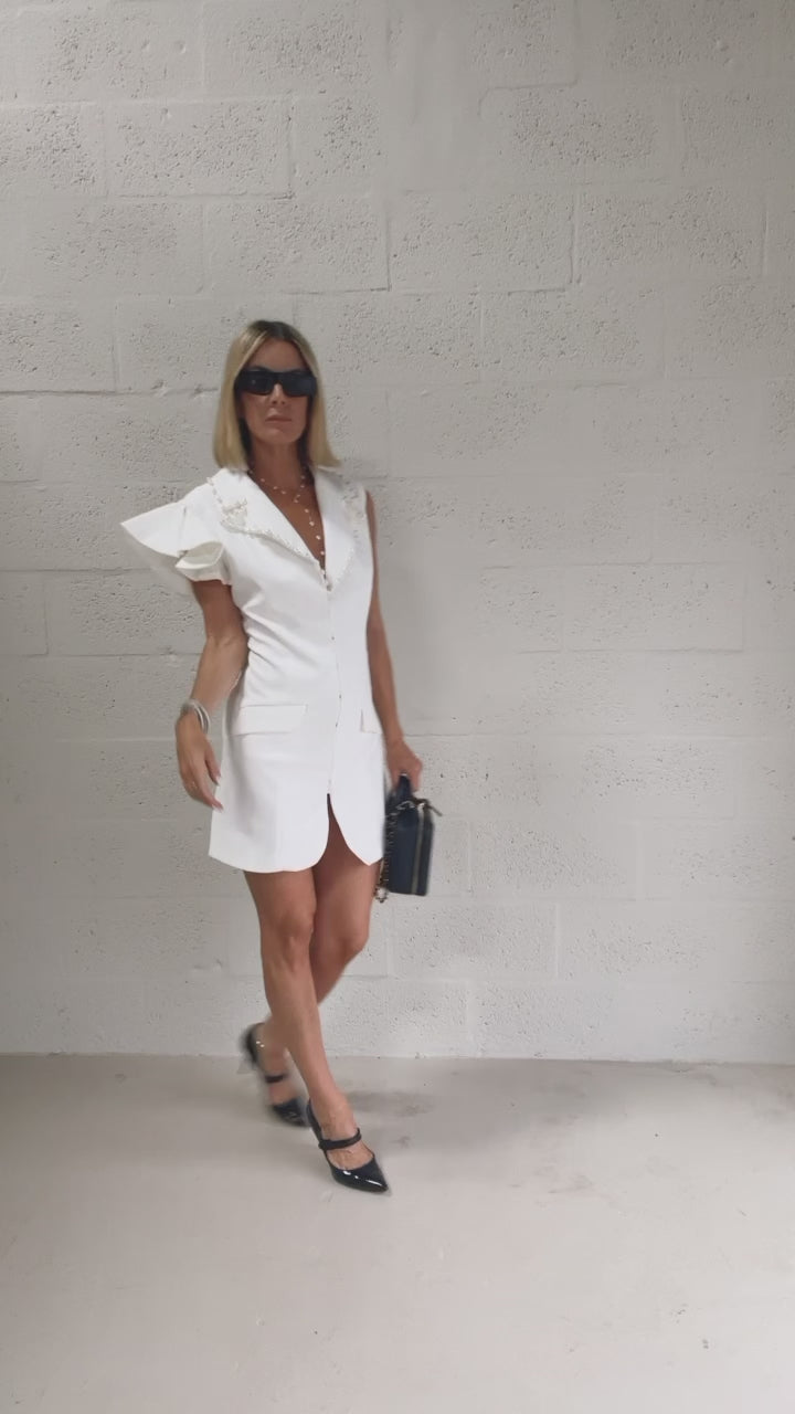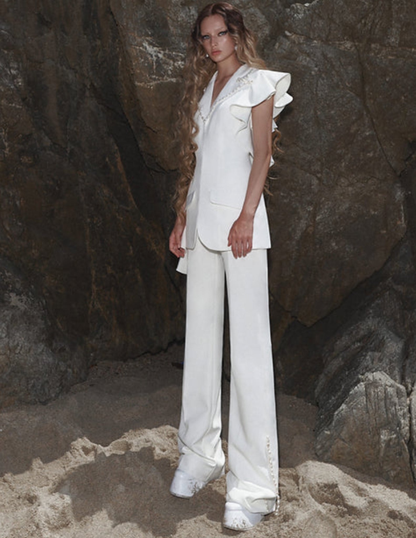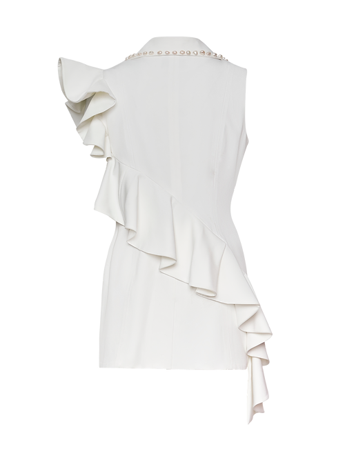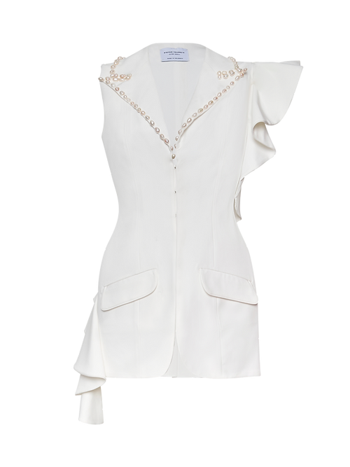 Our semi-fitted, tailored vest / blazer is hand-embroidered with natural pearls.