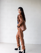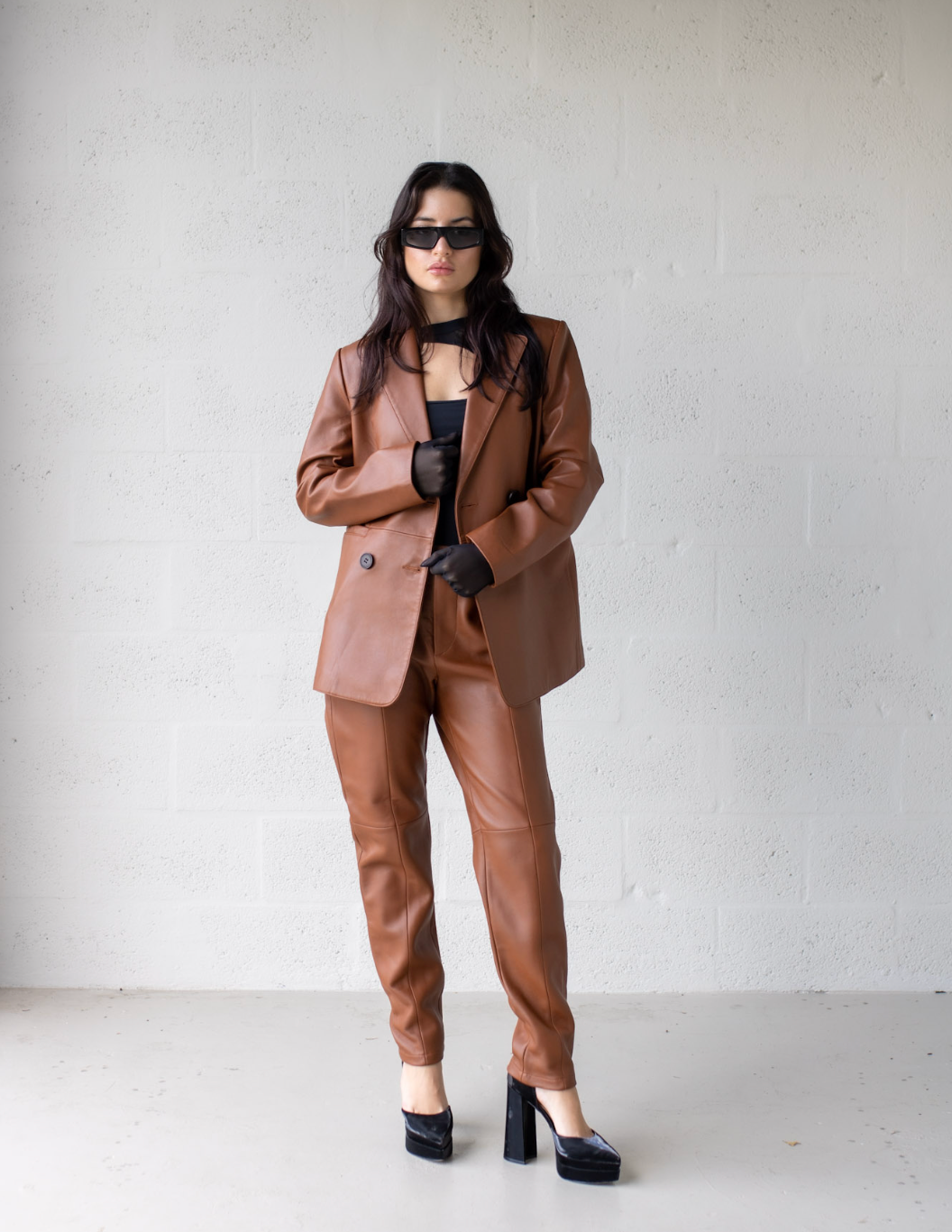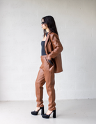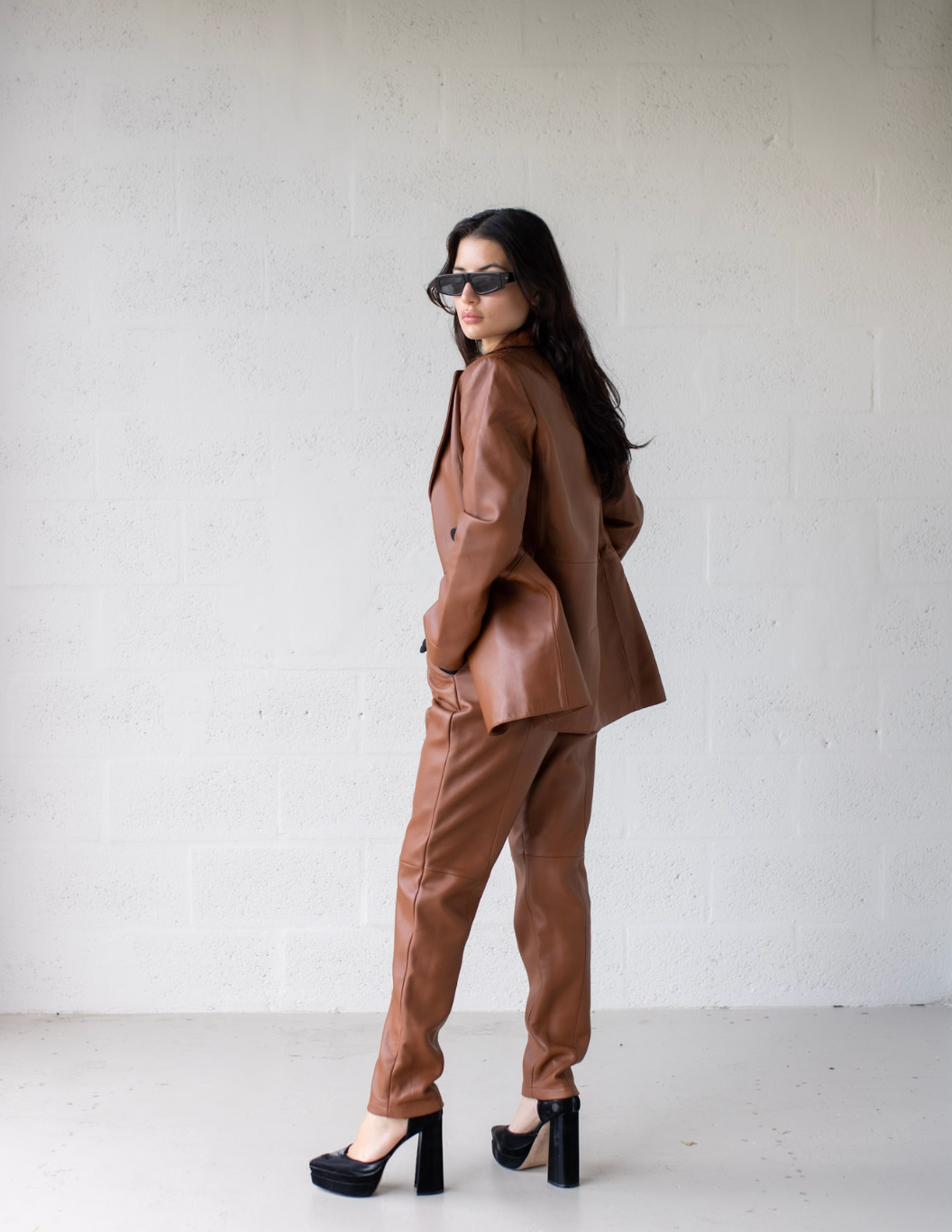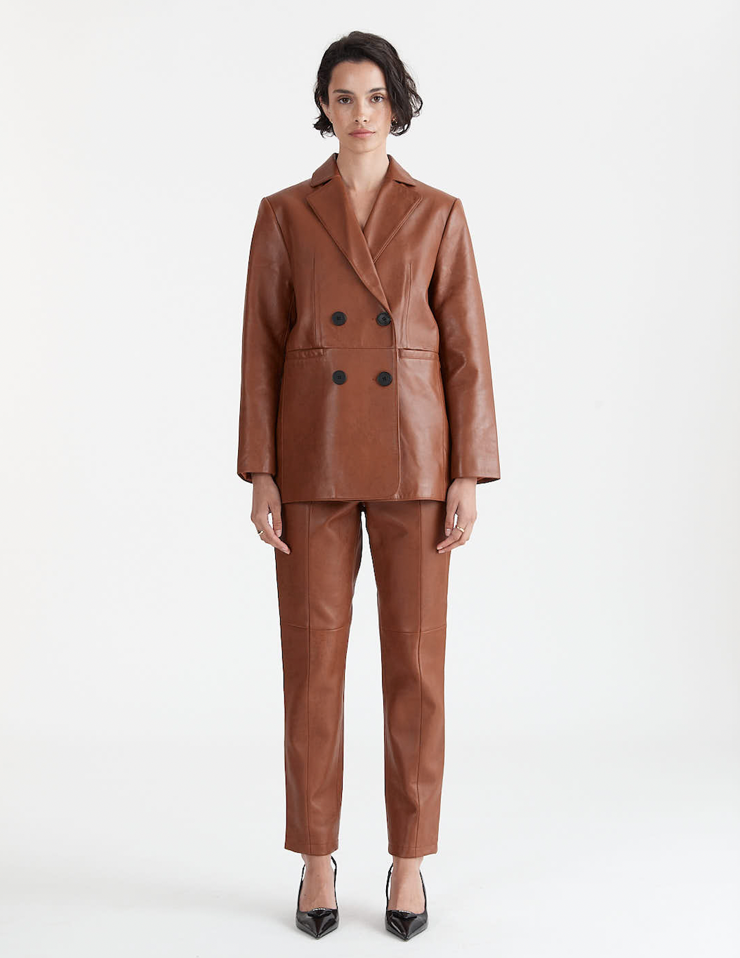 The Delaney Leather Blazer in a rich whiskey tone has been designed to stand the test of time. Crafted from our signature 100% New Zealand Lambs Leather, this blazer has been hand washed to achieve a vintage texture. This double breasted blazer is fully lined with welt pockets, a notched collar and notched lapel features.